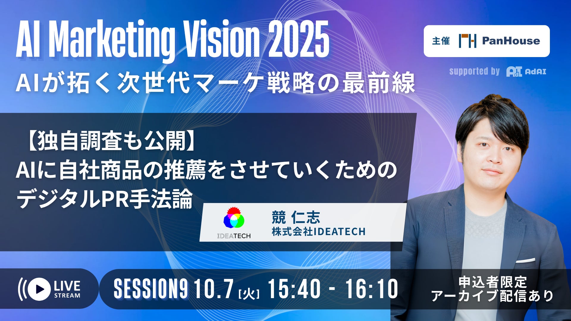 【10月7日(水)・8日(木)|カンファレンスのお知らせ】AIに自社商品の推薦をさせていくためのデジタルPR手法論を解説!「AI Marketing Vision 2025」にIDEATECHが登壇