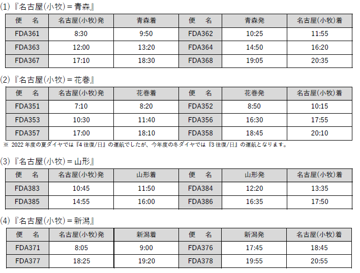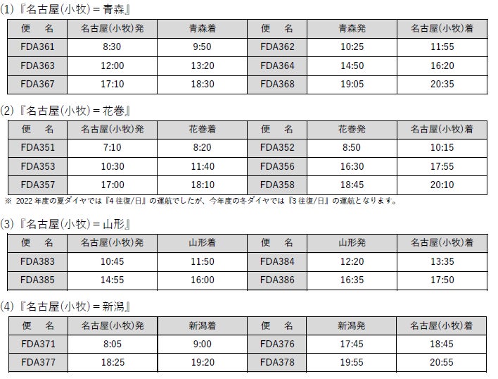 株式会社フジドリームエアラインズ(略称:FDA、本社:静岡県静岡市、代表取締役社長:楠瀬 俊一)は、2022年冬ダイヤ[2022年10月30日(日)~2023年3月25日(土)]ならびに運賃を決定し、国土交通省に届出をいたしました。