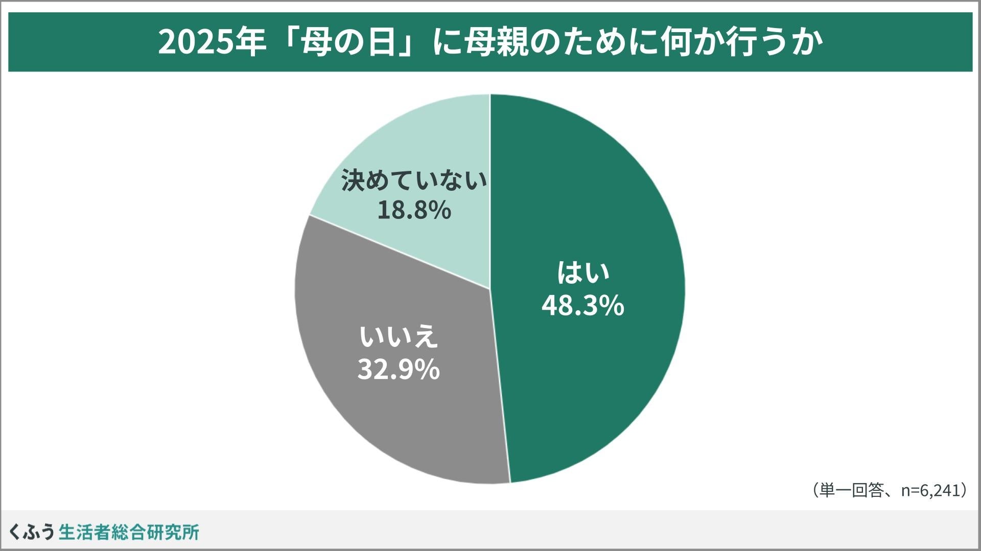 2025年の「母の日」は5月11日(日)。48.3%と約半数の人が母親に贈り物やその他の方法で「感謝の気持ちを伝える予定である」と回答しました。4月上旬の調査時点では18.8%が「決めていない」と回答したものの、多くの人が今年の母の日に何か行おうと考えていることがわかります。