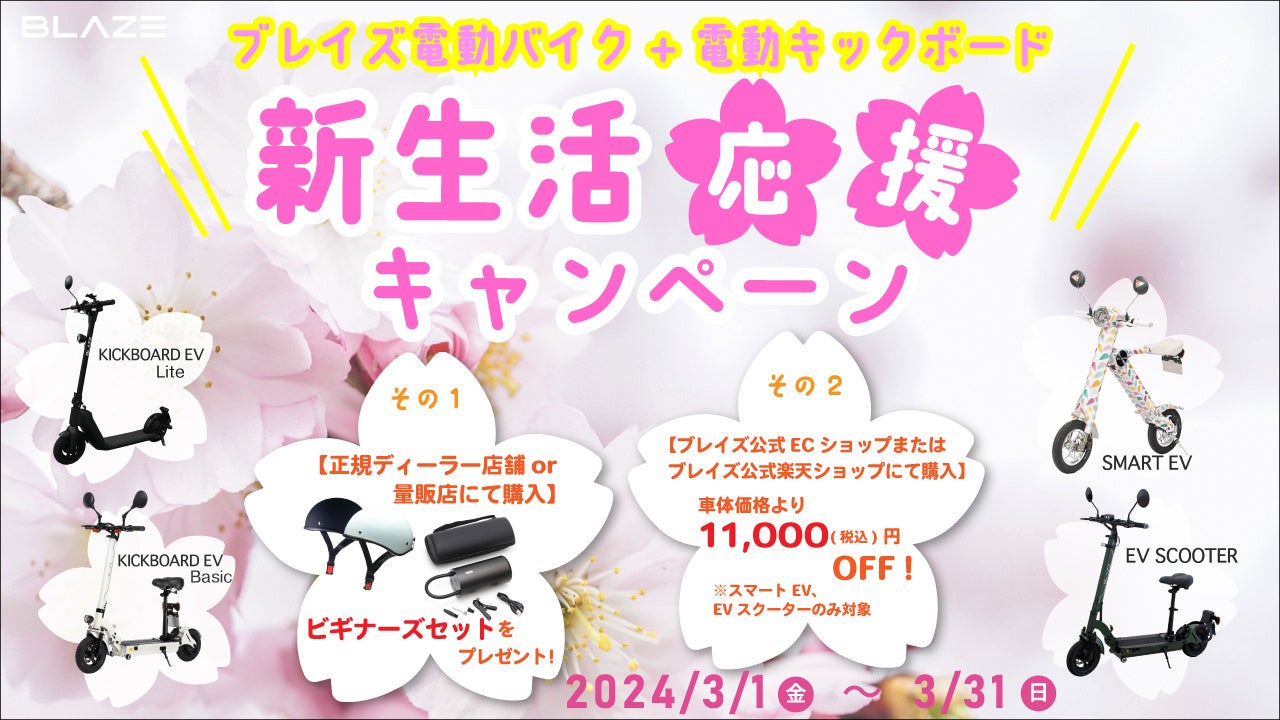 ブレイズの電動バイク&電動キックボードを対象とした「新生活応援キャンペーン」を実施中です。