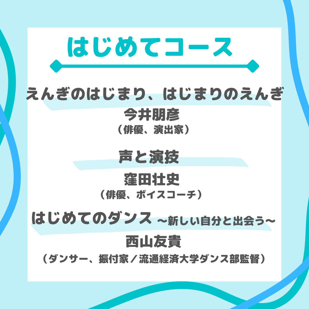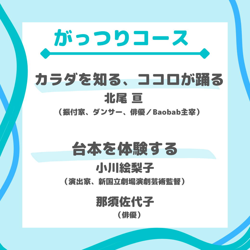 「はじめてコース」には今井朋彦、窪田壮史、西山友貴! 「がっつりコース」には北尾 亘、小川絵梨子、那須佐代子! 演劇界の第一線で活躍する俳優・クリエーター陣による 豪華ワークショップが今年も開催