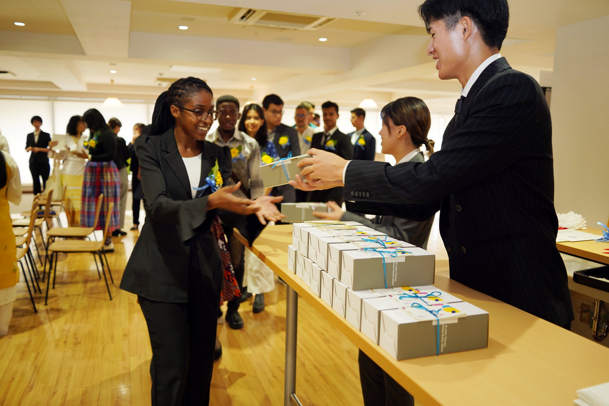 入学式の記念品として、学生たちが募金を募り制作したオリジナルロゴ入りマイボトルを新入生へ贈呈しました。このプロジェクトは「せっかくならエコにつなげたい」という想いから始まり、ペットボトルの使用を減らし、CO₂排出量を抑えることを目指しています。地球にやさしい選択をする人を増やすため、学生有志のFULKALAが企画・運営した取り組みです。