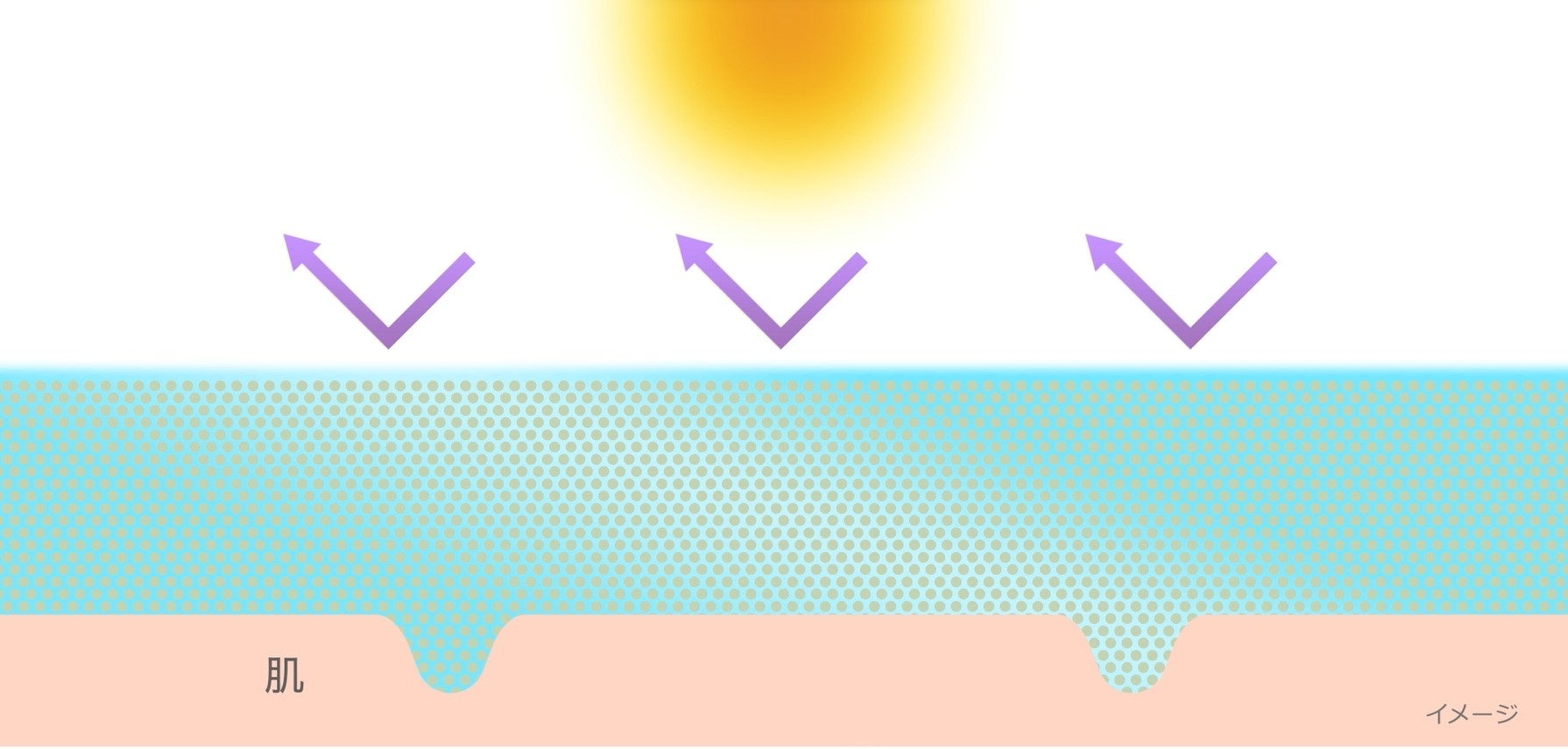 新処方を肌に塗布すると、紫外線散乱剤が肌にすき間なく積み重なって膜を形成することで、効率よく紫外線から肌を守ります(動画)。