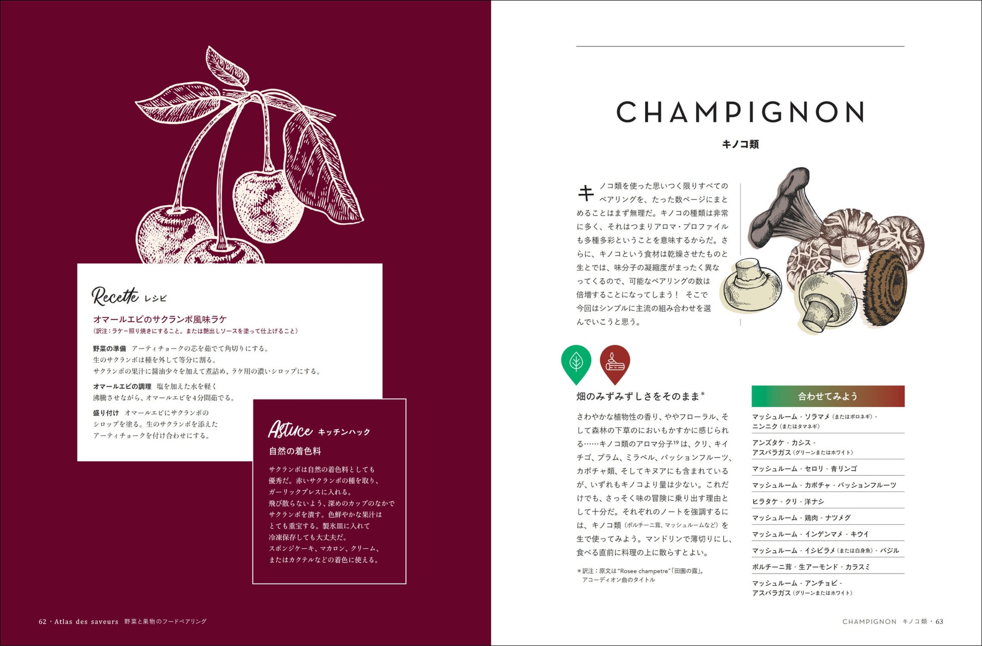 野菜、果物、そして海藻なども含むプラントベース食材は、いま注目の的! 掲載している約1500のペアリングアイデアは、斬新さと発見で、驚かれること間違いなし。例えば、トマト×煎茶×ハチミツ、キュウリ×チョコレート、チコリ×ビール×オレンジなどなど。化学に基づいているからと難しく考えず、まずは掲載ペアリングやレシピを実践してみましょう! 既存の定番レシピ以外のおいしさが実感できるはずです。