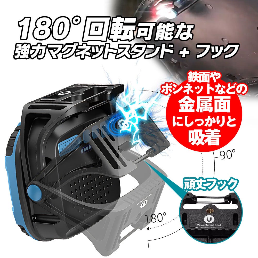 180°回転可能な強力マグネットスタンド+フックで車のボンネットや金属の柱などに取り付けでき釣り下げも可能。どこでも設置が出来ます。
