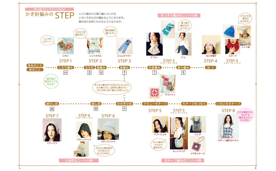 ①世界初「初心者ステップアップMAP」で、編み方も難易度も一目でわかります!