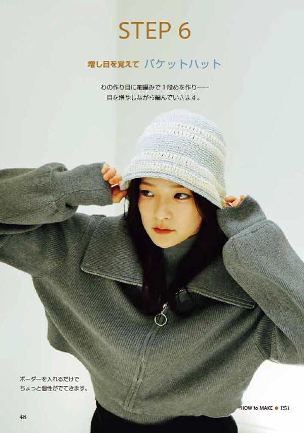 STEP5「わの作り目」をマスターしてモチーフを編みましょう。人気のグラニーモチーフが編めるようになります。STEP6では「増し目」を覚えて立体的なバケットハット、STEP7では「減らし目」を使ったイヤーマフを編みます。編みたい作品を編むのではなく、順番に基礎から練習すること。これが帽子やモチーフ編みの作品など、編んでみたいものを思ったようにちゃんときれいに編める一番早い方法です。モチーフが編めるようになったらつなげてベストにも。