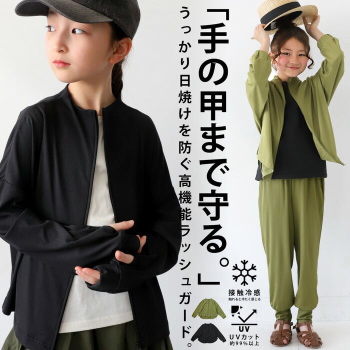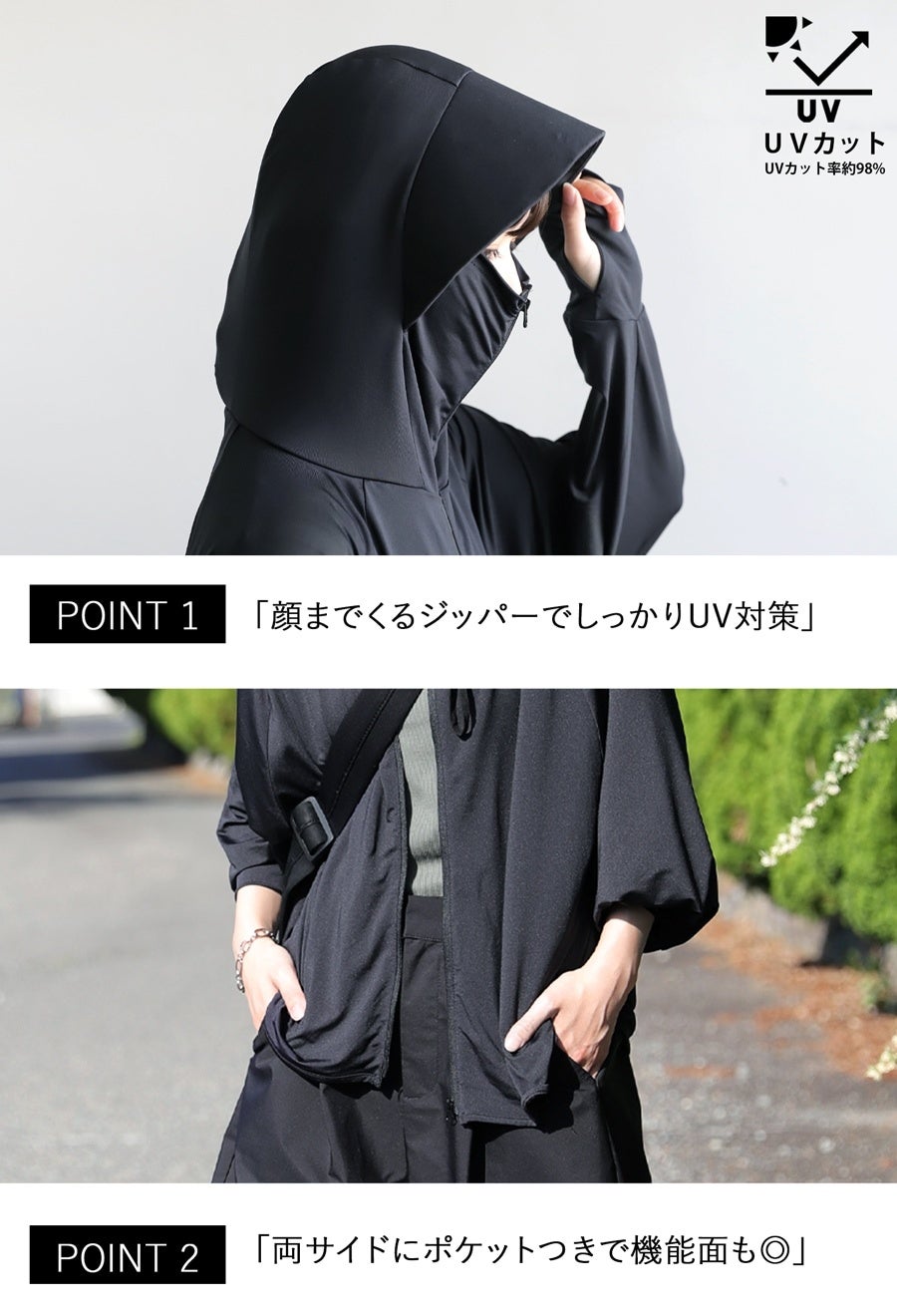 紫外線が気になる季節にうれしい、UVカット率98%以上の生地を使用。顔まわりや首元、手の甲までしっかり覆えるデザインで、日差しから肌をやさしく守ります。
