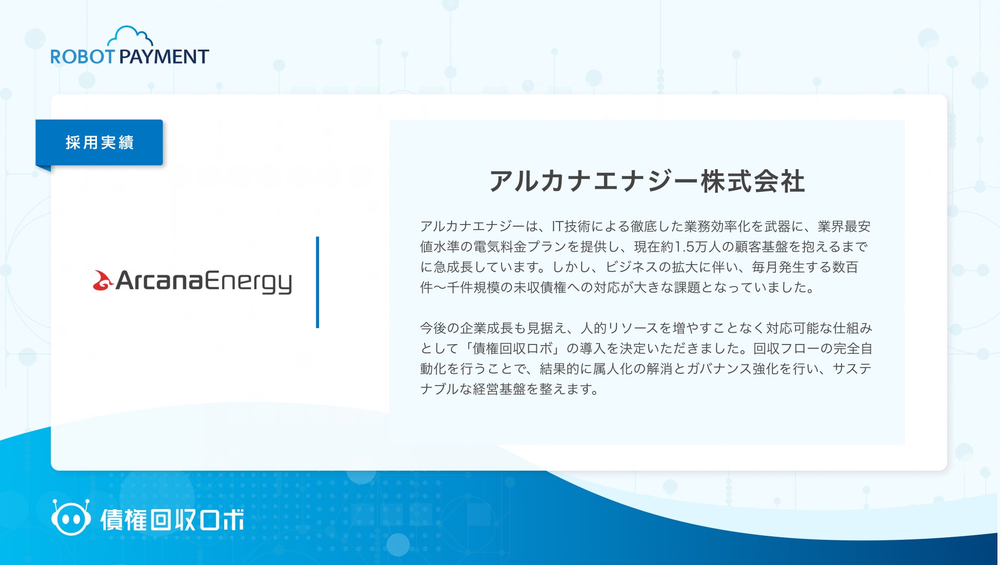 企業のお金の流れを円滑にし、新たな価値創造を促進する株式会社ROBOT PAYMENT(本社:東京都渋谷区、代表取締役執行役員CEO:清久 健也、証券コード:4374、以下 当社)は、督促・回収のデジタルインフラ「債権回収ロボ」が、アルカナエナジー株式会社(本社:東京都港区、以下 アルカナエナジー)に採用されたことをお知らせします。