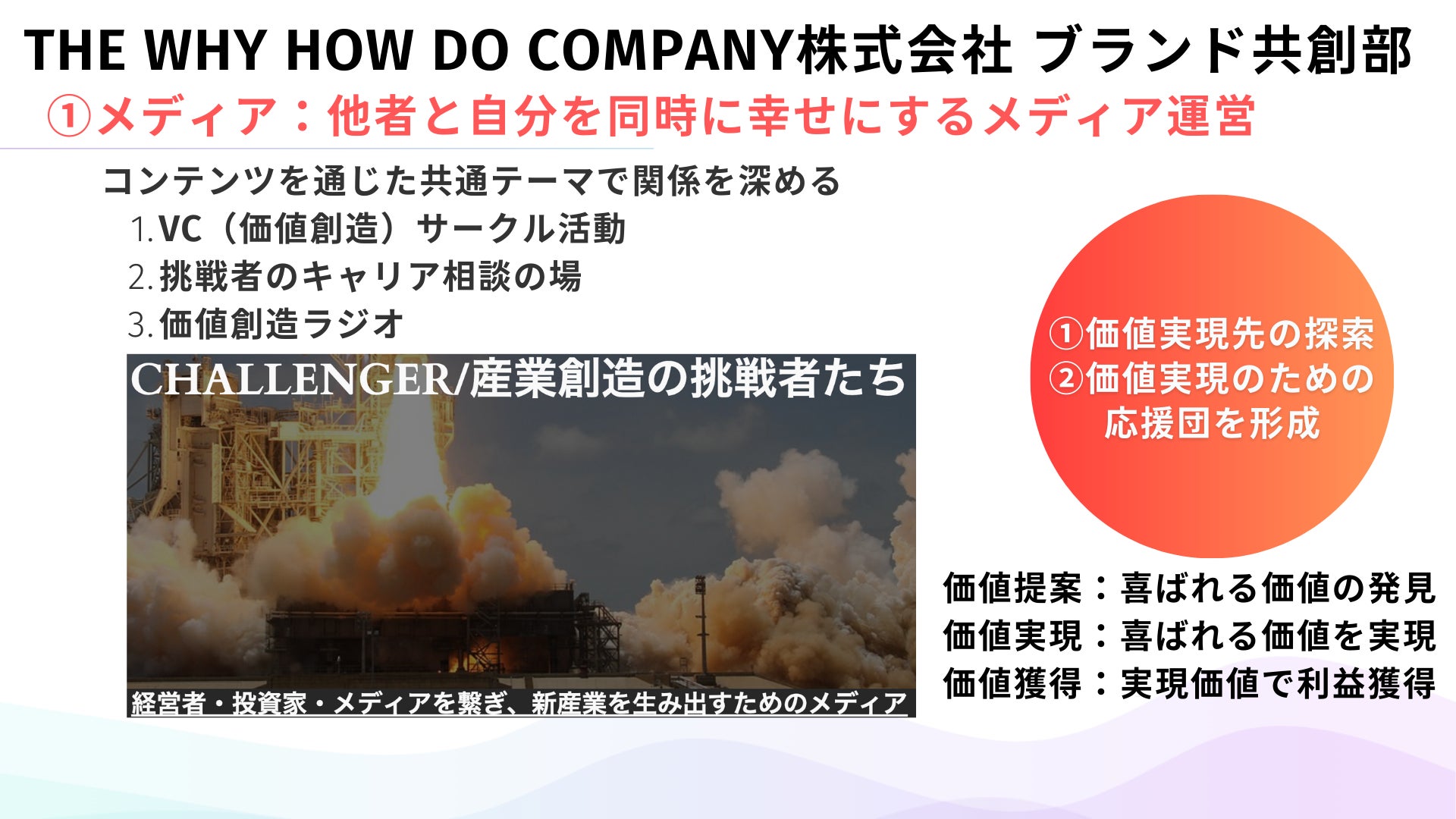 自社メディア「CHALLENGER/産業創造の挑戦者たち」やラジオ番組等を活用し、大手企業の新規事業担当者・役員へのインタビューや事例発信。編集長はブランド共創部 担当部長の浜崎。累計60以上のメディア支援実績