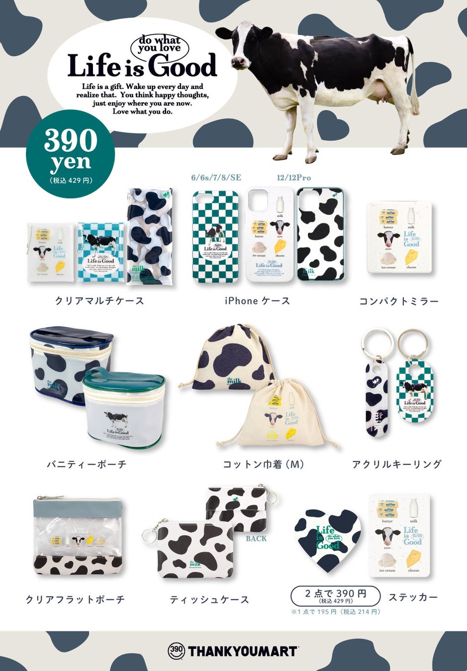 390円(税込429円)を中心としたかわいいアイテムが集まるショップ「サンキューマート」を運営するエルソニック株式会社は、サンキューマートオリジナル雑貨シリーズの新作を10月下旬より入荷順次販売開始いたします。トレンドの「moomoo柄」(うし柄)をテーマにデザインした、サンキューマート限定アイテムです。