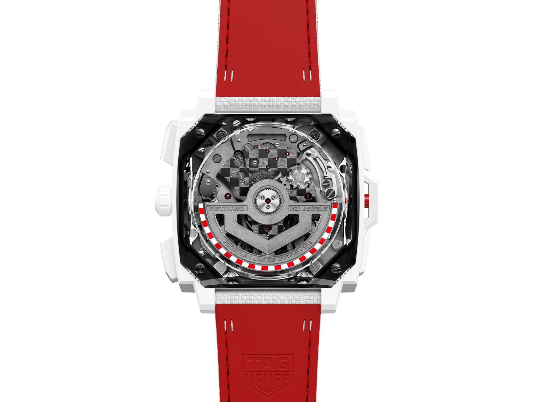 F1との深いつながりをさらに強調するのが、ミニッツトラックの6時位置に控え目に配されたF1のロゴ。12時位置に輝くグリーンとレッドのタグ・ホイヤー シールドには、リューズ上のシールドと呼応するように手作業でラッカー仕上げが施され、レーシングDNAを締めくくるタッチを添えています。