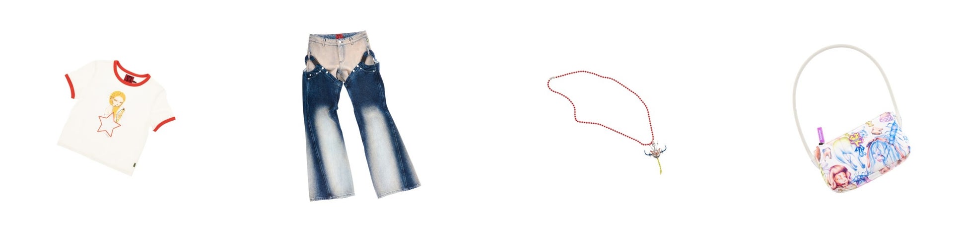 左から、エリ スター メッシュ ベビーT¥14,300 / チャップ ウォッシュド パンツ¥47,300 / キーガン ダッカー ペンダント¥15,400 / カレッジ ショルダーバッグ¥28,600