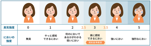 実証実験の環境は臭気強度3.0であり、悪臭防止法の対処すべき規制基準範囲(臭気強度2.5~3.5)でした。