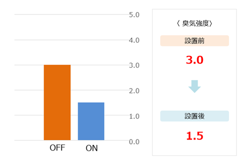 結 果 :「QAIS-air- 04A1J」稼働前のスコアは3.0「楽に感知できるにおい」だったが、稼働後のスコアは1.5となり、「何のにおいであるかがわかる弱いにおい」「やっと感知できるにおい」の間のスコアまで下がった。