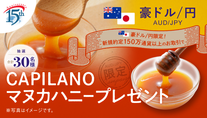 キャンペーン期間中、豪ドル/円(AUD/JPY)にて新規約定150万通貨以上のお取引をいただいたお客さまの中から抽選で総勢30名様に、取引数量に応じて、オーストラリア産高級ブランド「CAPILANO(カピラーノ)」の人気マヌカハニーをプレゼントいたします。