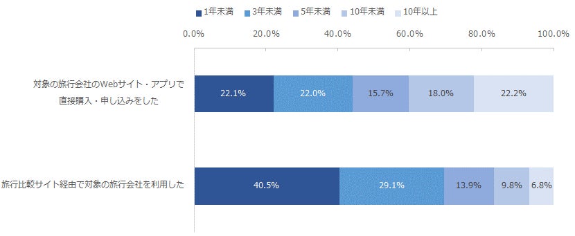 これら旅行の購入・申し込みをした手段別に、初めて該当の旅行会社を利用してからの年数を分析したところ、「対象の旅行会社のWebサイト・アプリで直接購入・申し込みをした」利用者においては、10年以上利用している利用者が22.2%と最も高くなりました。一方で「旅行比較サイト経由で対象の旅行会社を利用した」と回答した利用者においては1年未満の利用者が40.5%と最も高くなり、旅行比較サイトを経由した利用者においては利用年数が短い傾向がみられました。