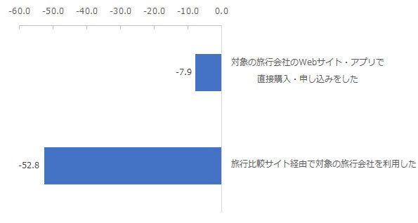 これらの手段別にNPSも分析したところ、「対象の旅行会社のWebサイト・アプリで直接購入・申し込みをした」と回答した利用者のNPSが-7.9ポイントであった一方、「旅行比較サイト経由で対象の旅行会社を利用した」と回答した利用者のNPSは-52.8ポイントと差がみられました。