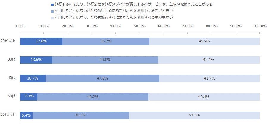 これらのAIの利用状況を年代別に調査したところ、20代以下における旅行でのAIの利用率は17.8%となり、若年層ほど利用率が高い傾向がみられました。また「利用したことはないが今後旅行するにあたり、AIを利用してみたいと思う」と回答した利用者は、若年層に限らず40代や50代でも高い傾向がみられました。