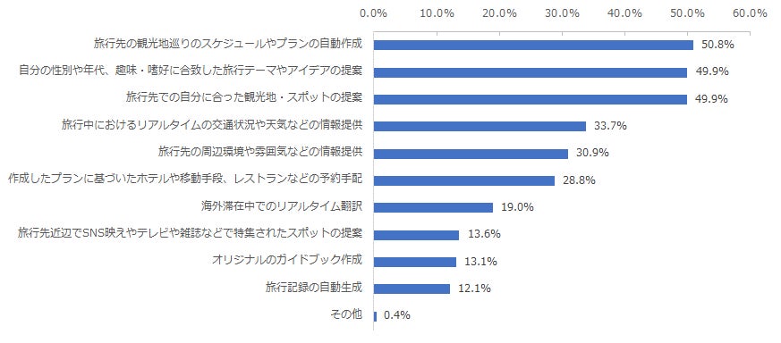 さらに、旅行するにあたってAIを使ったことがある利用者と、AIを利用したい意向がある利用者に対して、今後どのような形でAIの活用を期待しているか調査したところ、最も高くなったのは「旅行先の観光地巡りのスケジュールやプランの自動作成」(50.8%)となり、次いで「自分の性別や年代、趣味・嗜好に合致した旅行テーマやアイデアの提案」(49.9%)、「旅行先での自分に合った観光地・スポットの提案」(49.9%)が続きました。