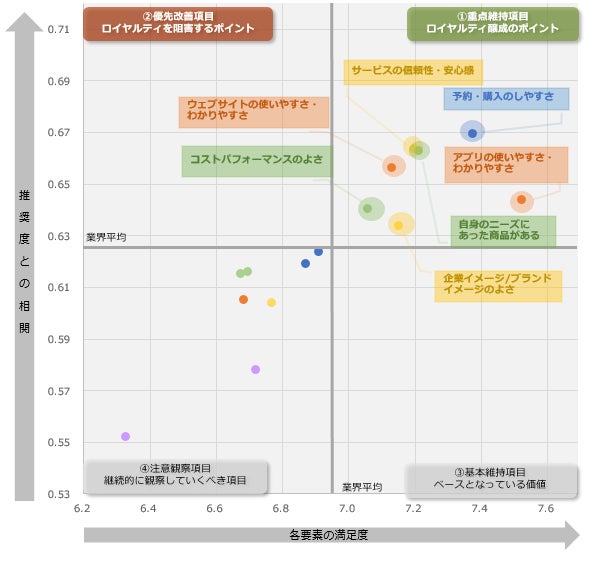 一方で業界全体で求められる改善項目はみられず、業界全体のロイヤルティを醸成する要因をさらに高めていくことが求められる結果となりました。