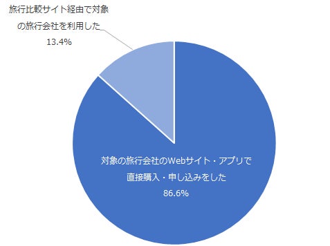 旅行業界においては、複数の旅行予約サイトを横断で検索し、宿泊施設や航空券などを料金比較できる旅行比較サイト(Trivagoやトラベルコなど)の利用がみられています。該当の旅行会社の利用において、購入・申し込みをした手段を調査したところ、全体の13.4%が「旅行比較サイト経由で対象の旅行会社を利用した」と回答しました。また、「対象の旅行会社のWebサイト・アプリで直接購入・申し込みをした」と回答した割合は86.6%となりました。