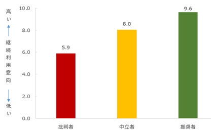 対象のネット専業型旅行会社の利用に対し、今後の継続利用意向を0~10の11段階でたずねたところ、「推奨者」(推奨度が「9」~「10」の回答者)は平均9.6ポイント、「中立者」(推奨度が「7」~「8」の回答者)は平均8.0ポイント、「批判者」(推奨度が「0」~「6」の回答者)は平均5.9ポイントとなり、推奨度が高いほど継続利用意向も高くなる結果となりました。