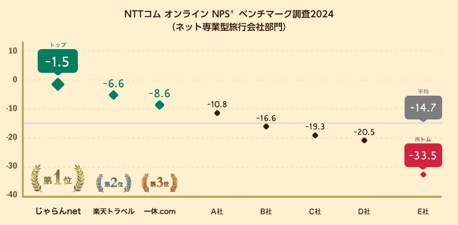 NTTコム オンライン・マーケティング・ソリューション株式会社(本社:東京都品川区、代表取締役社長:塚本 良江、以下NTTコム オンライン)は、NPSベンチマーク調査2024ネット専業型旅行会社部門を実施しました。この結果、最もNPSが高いのはじゃらんnetとなりました。