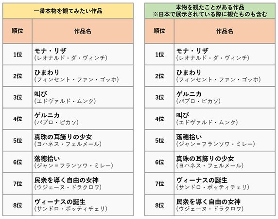 一番本物を観てみたい作品、本物を観たことがある作品についてもアンケートをとりました。両方で1位、2位となった「モナ・リザ」「ひまわり」は、どの国の美術館所蔵か知っている割合の順位とも同じです。