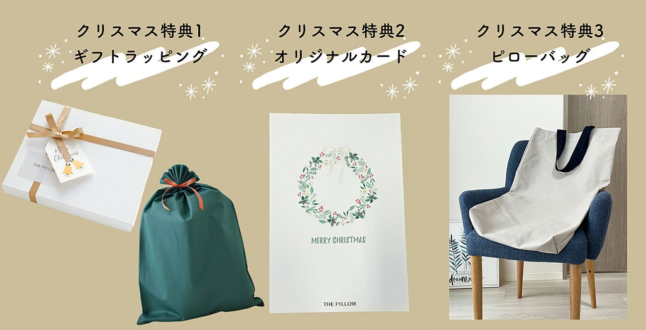 THE PILLOW では、12月25日(水)まで「クリスマスキャンペーン 2024」を開催。クリスマス仕様の特別ラッピングのほか、期間限定&数量限定でもれなく「Xmasカード」と「THE PILLOW Bag(5,500円相当)」をプレゼント。