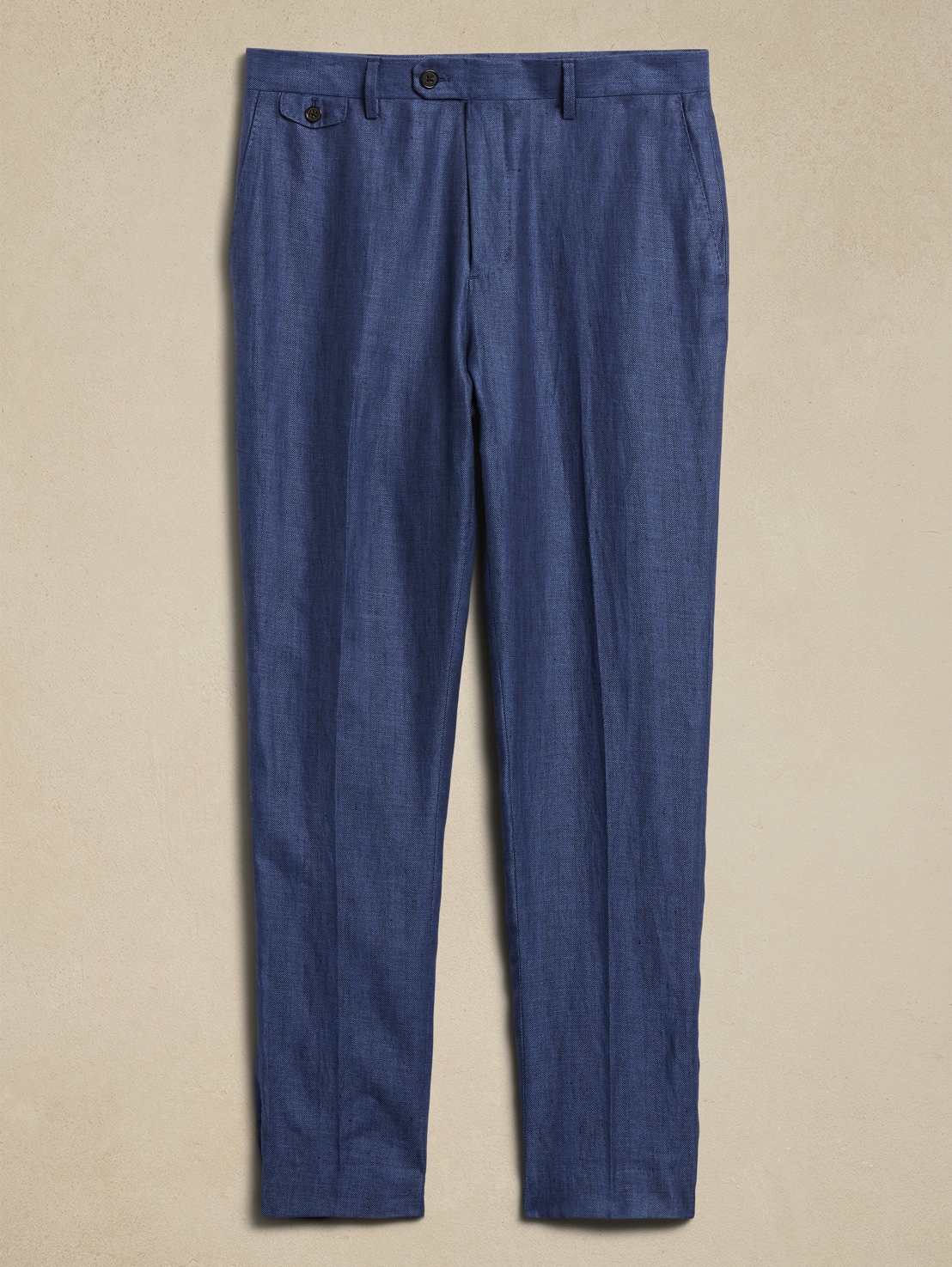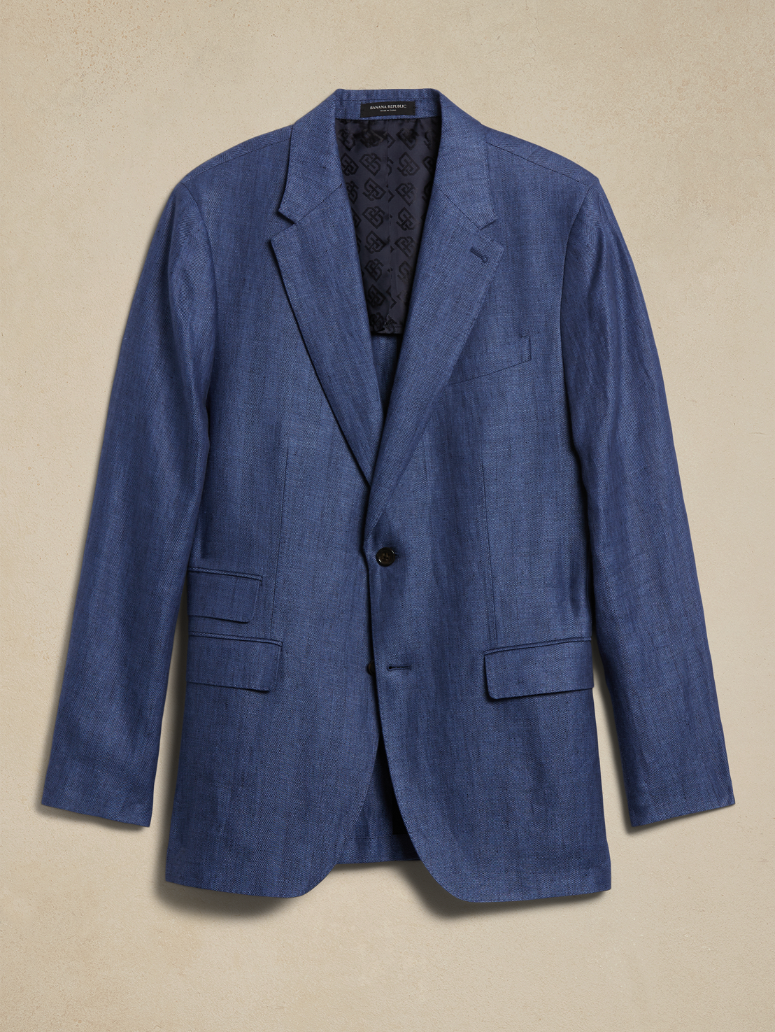 100%リネン素材のヘリンボーンジャケット×スリムトラウザーのセットアップは、水を想起させる涼し気なブルーで爽やかな印象に仕上げます。