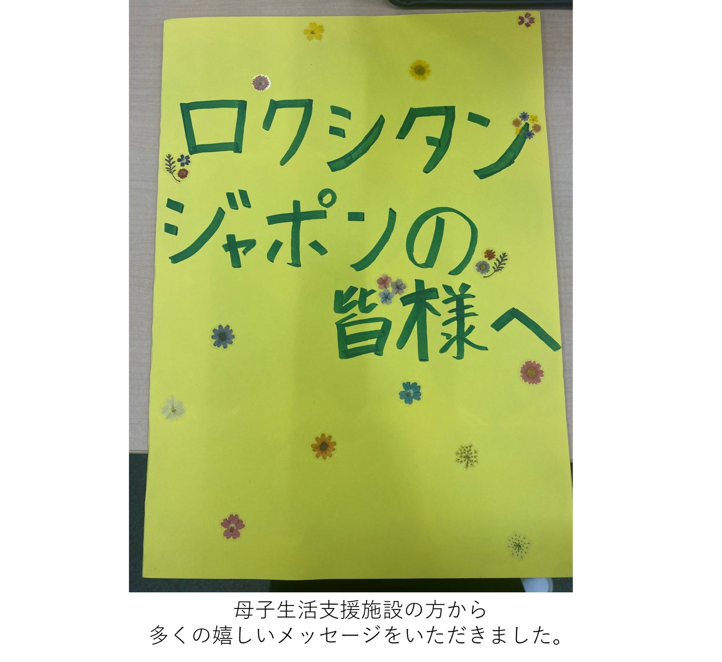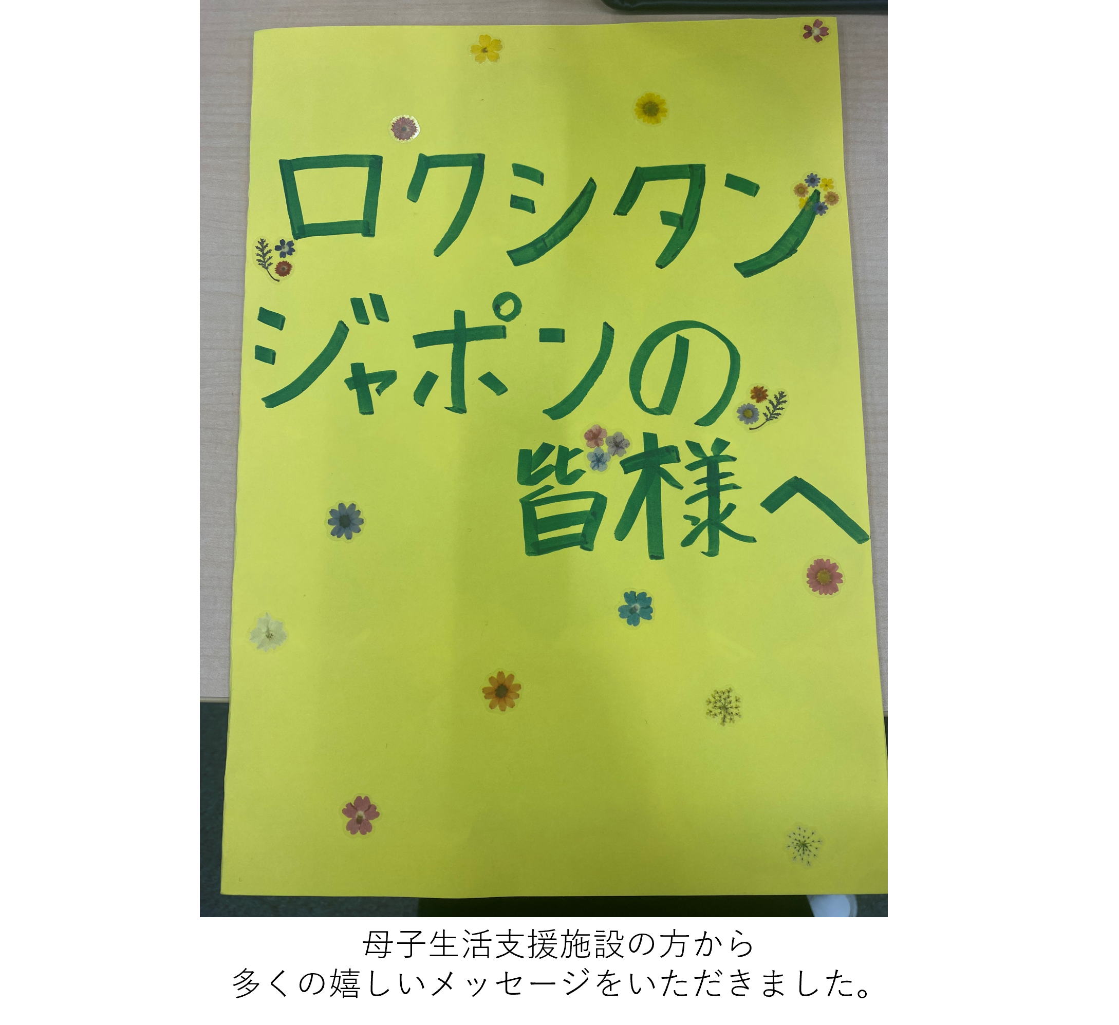 昨年のロクシタンホリデーのテーマは、「幸せ・喜びがあつまるオリーブツリー」ロクシタンの故郷・プロヴァンスでは、オリーブツリーは幸せや絆の象徴として大切にされてきました。「様々な事情を抱えた方々にもロクシタン製品を通して、笑顔と温もりでいっぱいになってほしい」という思いを込めて、昨年12月、ロクシタンから全国計170箇所の母子生活支援施設に5,605個のホリデーギフトをお送りいたしました。施設で暮らす母親と母子を支える職員の方々から、「香りに癒されました。」「心安らぐ香りで嬉しかった。」「苦しい日々の中でもいただいたロクシタン商品の香りをかぐとがんばろうという気持ちになります。」「産後で自分のお手入れが出来ていなかったので、ロクシタンでしっとりしました。」など、多くの喜びの声をいただきました。
