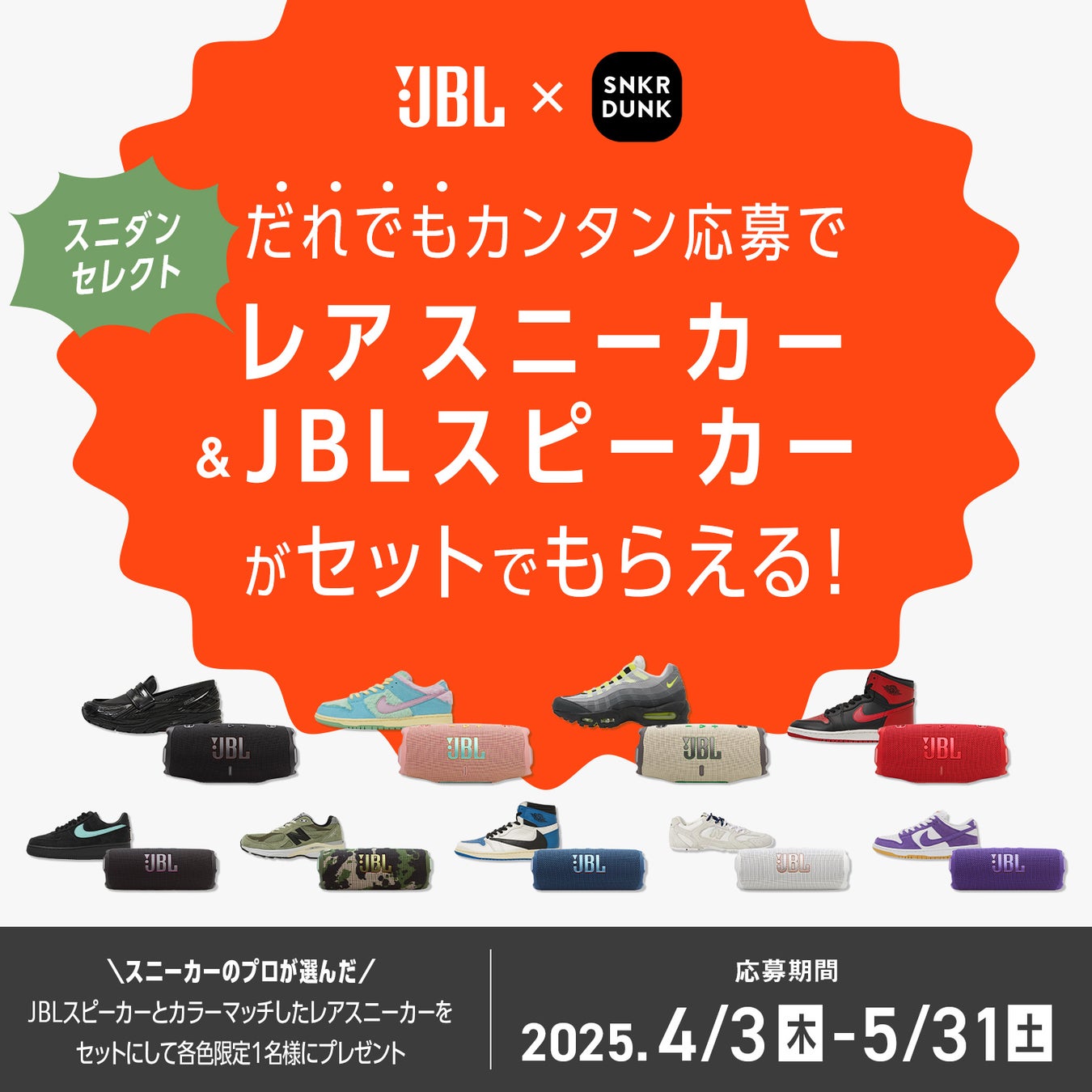 また、本日発表の新製品「JBL Flip 7」「JBL Charge 6」をより多くの人に知っていただくために、昨年の実施で好評を得た、国内最大級のスニーカーアプリ「スニーカーダンク(スニダン)」とのコラボレーションを今年も開催。抽選でレアスニーカーが当たるプレゼント企画を実施いたします。本企画では、「Flip 7」「Charge 6」の心躍るカラー展開に合わせたスニーカーを9足ご用意。豊富なカラーバリエーションでファッション性の高いポータブルBluetoothスピーカーとマッチするレアスニーカーをお楽しみいただけます。さらに、「スニダン」でも会員登録の上ご応募いただくと当選確率が2倍にアップ!ぜひ好きなカラーを選んで対象期間中にご応募ください。