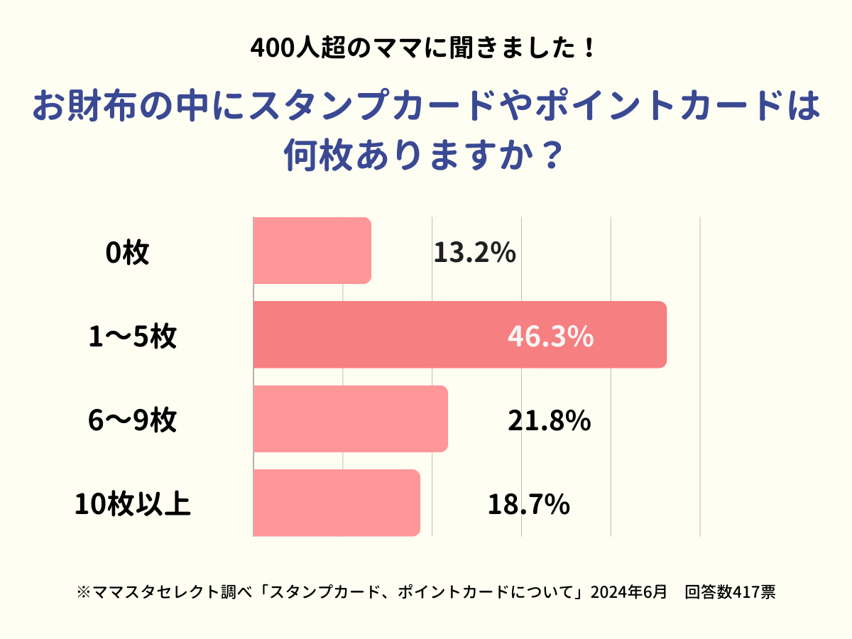 キャッシュレス決済の普及が進み、ポイントもアプリで管理できるなどのデジタル化が進んでいる時代。そんななかでもお財布の中にスタンプカードやポイントカードが入っている人がいるのか、入っているとしたら何枚か、という点を探るべく、ママスタセレクトではアンケート調査を実施しました。