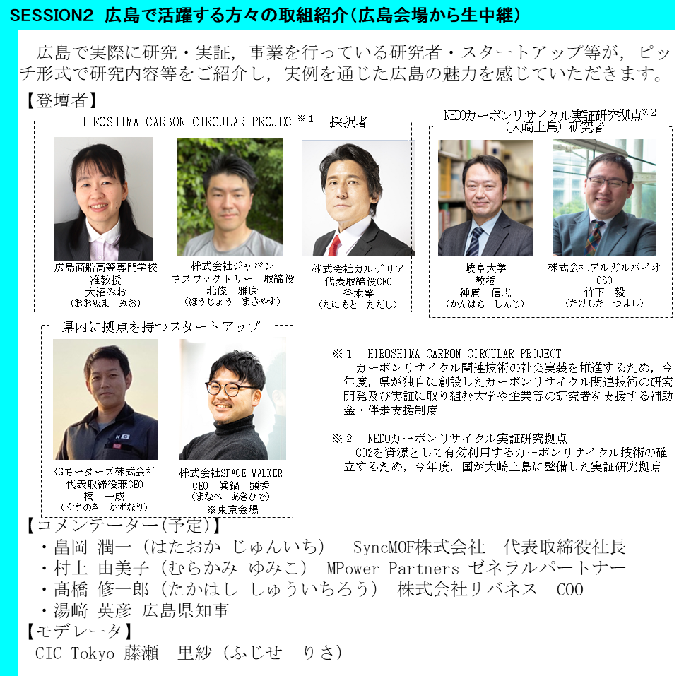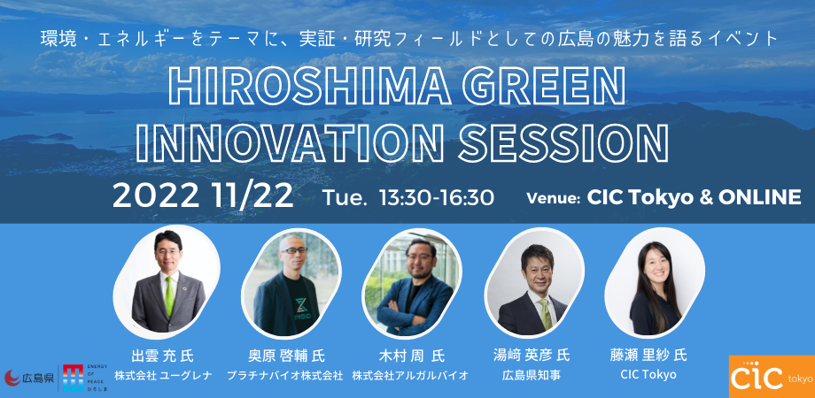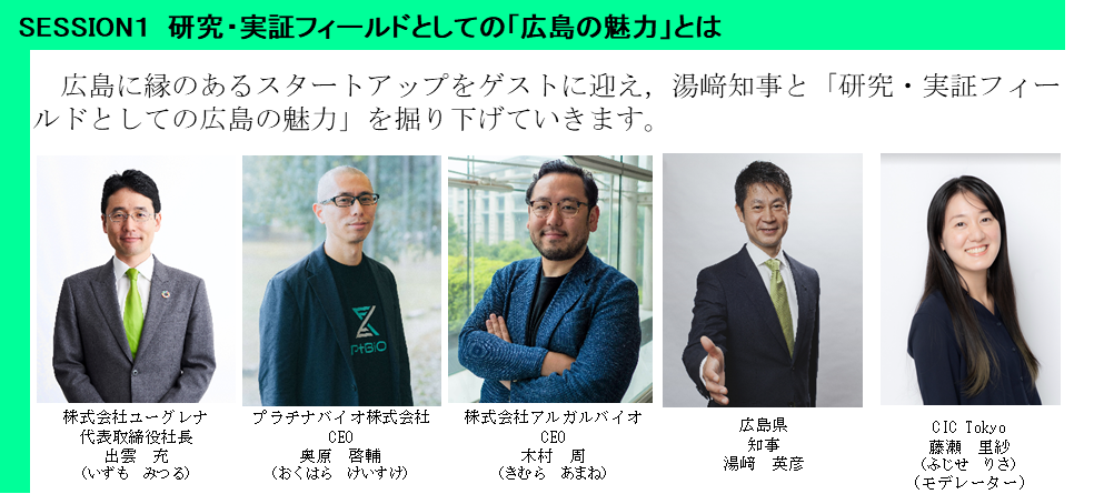この度,その当事者の方々にお集まりいただき,研究や実証をサポートする方々や広島に縁のあるスタートアップ,湯崎知事を交え,環境・エネルギーをテーマに,研究・実証フィールドとしての「広島の魅力」を語っていただきます。