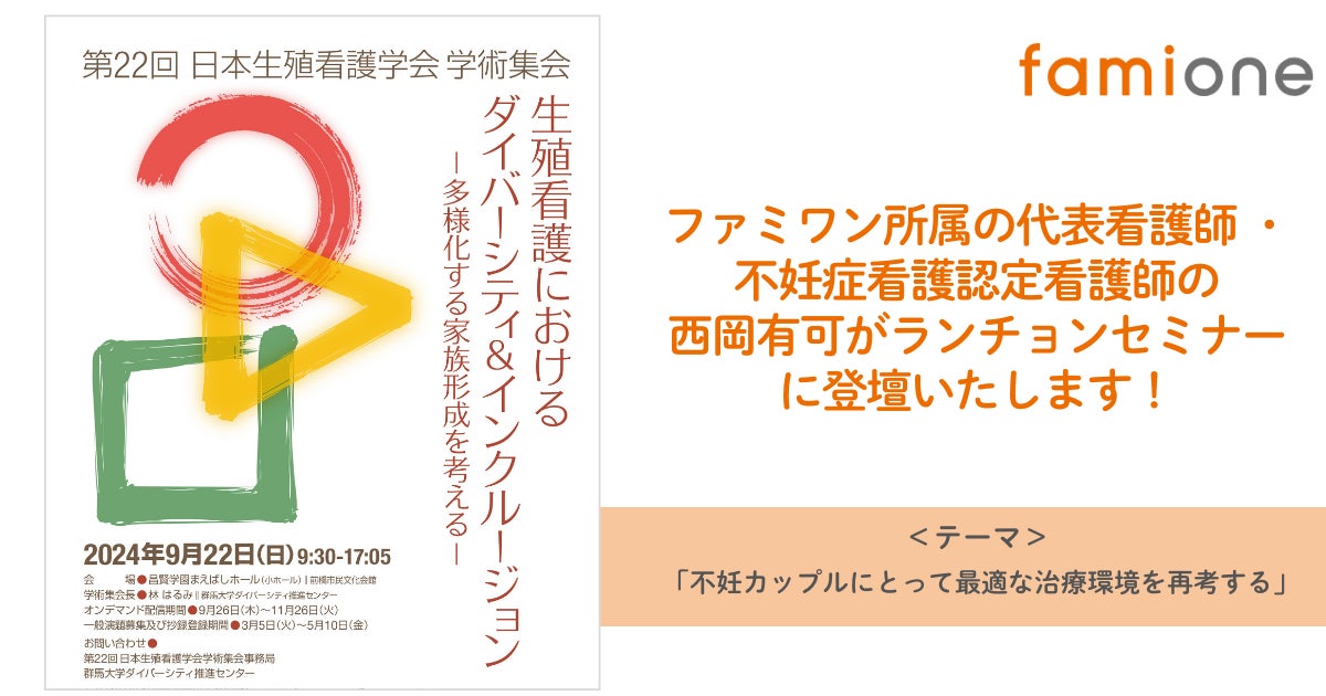 「子どもを願うすべての人によりそい 幸せな人生を歩める社会をつくる」をビジョンに掲げ、法人の従業員向け福利厚生や自治体の住民向け支援を行うヘルスケアサポートサービス「ファミワン」https://famione.com/benefit/ などを展開する株式会社ファミワン(本社:東京都渋谷区、代表取締役:石川勇介、以下当社)の代表看護師・不妊症看護認定看護師の西岡 有可は、2024年9月22日(日)第22回 日本生殖看護学会学術集会にて、製薬企業によるランチョンセミナーに登壇いたします。