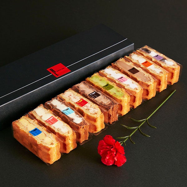 ふんわりと焼きあげるこだわりのワッフル生地に、フルーツやクリームをサンドした人気のワッフルケーキです。10種類の味をセットにしています。