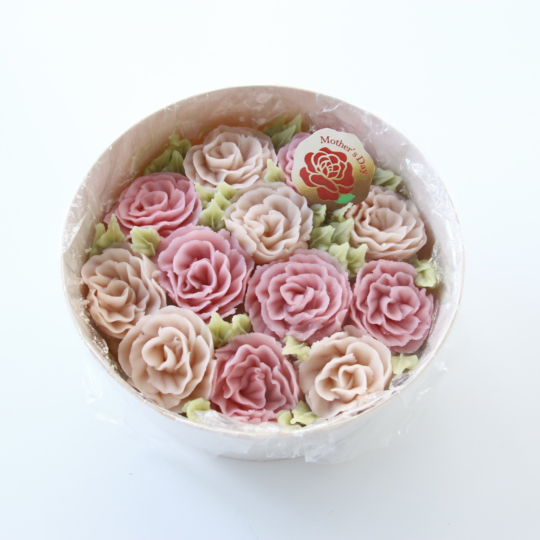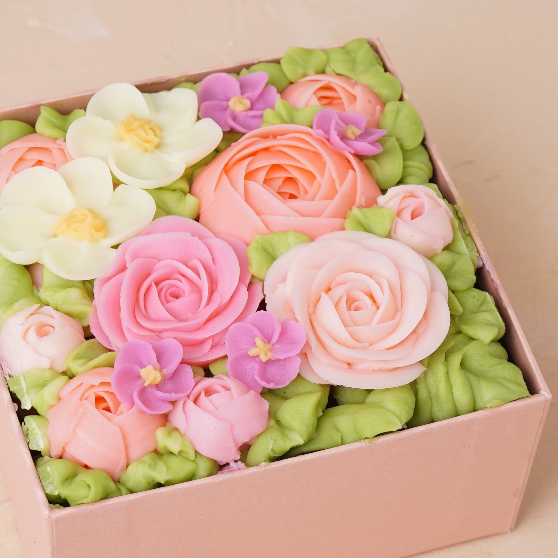 開けた瞬間、花のような笑顔咲く、食べられるお花のボックスフラワーケーキ。専用BOXはお花をそっと優しく包み込むパールピンクでアレンジ。大切なお花は一枚一枚、心を込めて丁寧に絞られています。