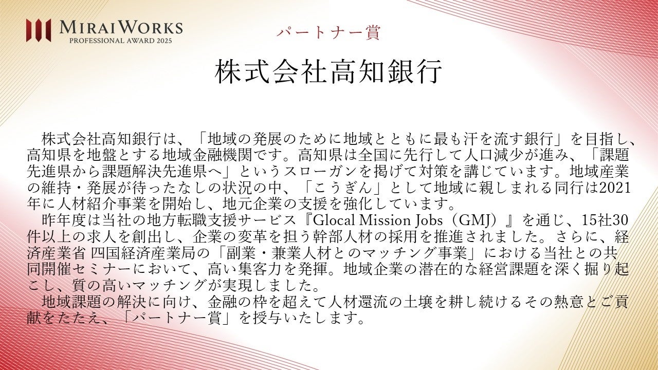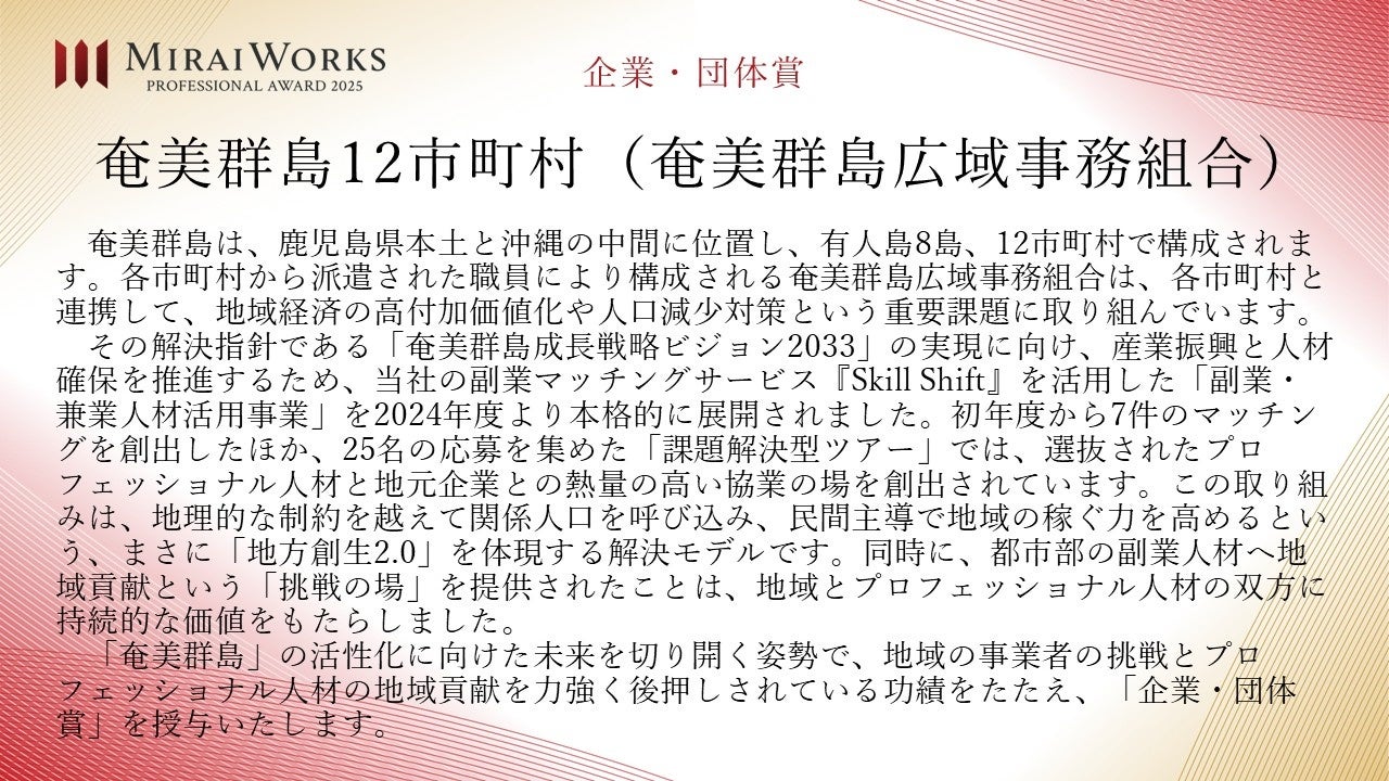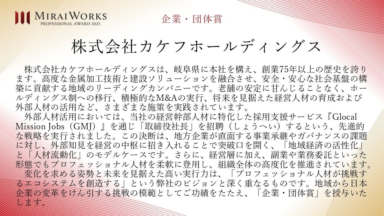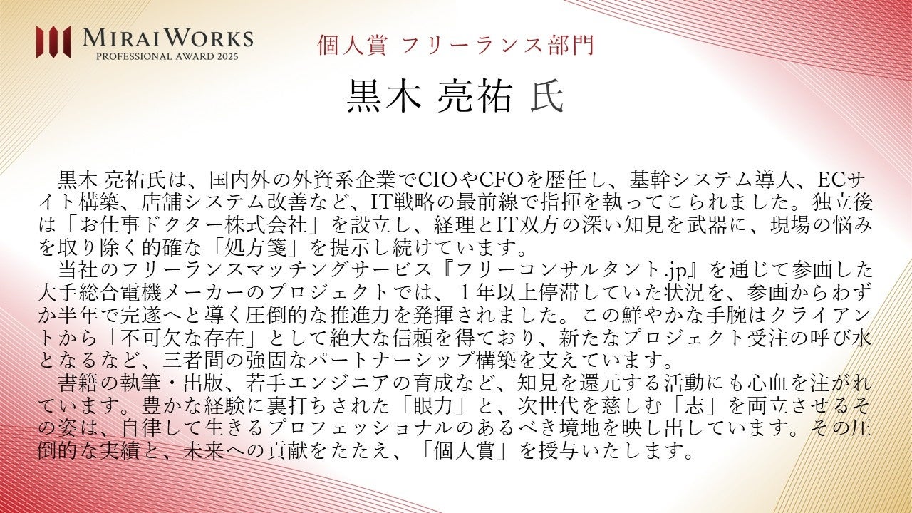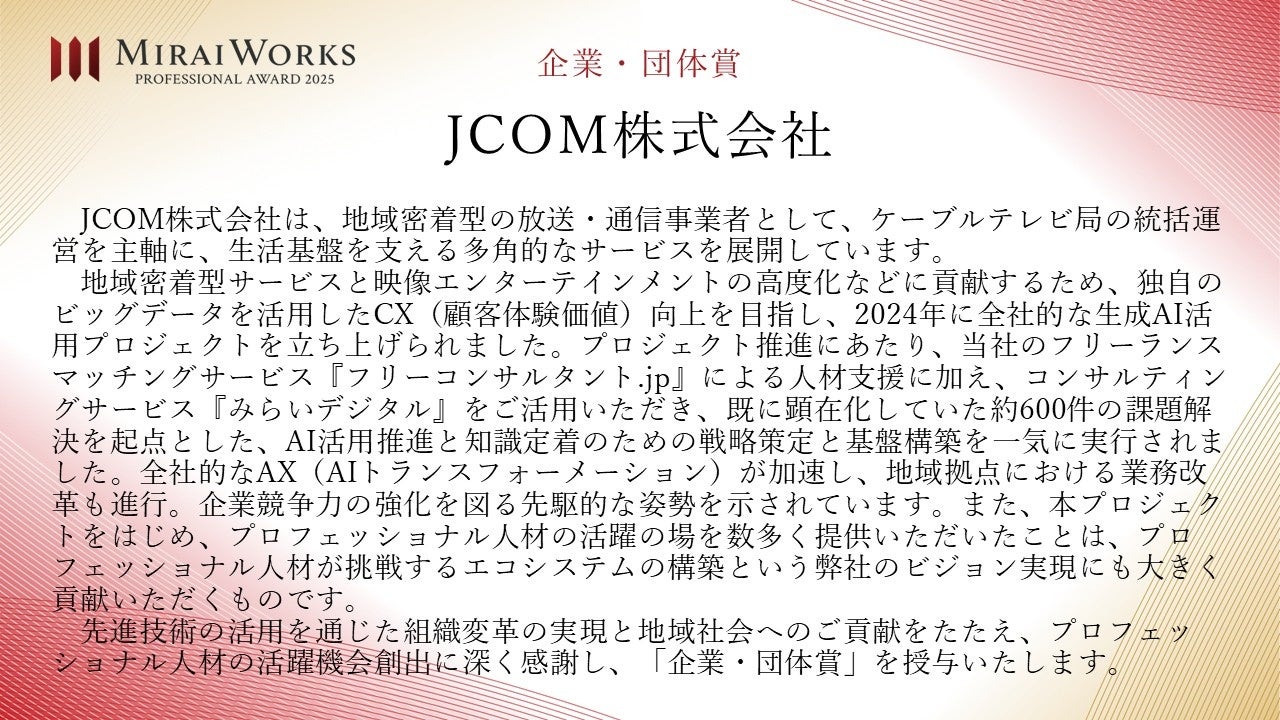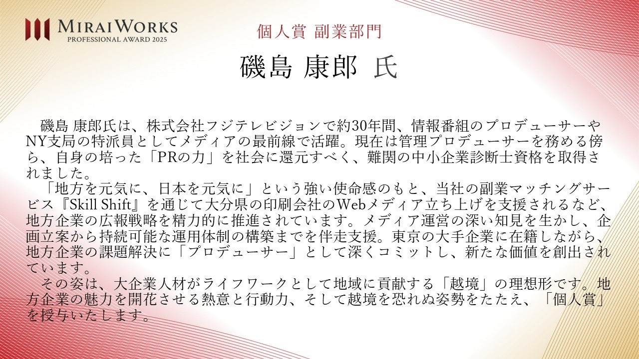 株式会社みらいワークス(本社:東京都港区、代表取締役社長 岡本祥治、以下「当社」)は、「プロフェッショナル アワード」の2025年受賞者を決定し、授賞式を執り行いましたことをお知らせいたします。
