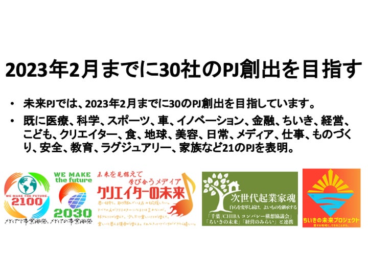 2030年、2100年(https://prtimes.jp/main/html/rd/p/000000261.000018590.html)といった時間軸で掛け合わせることも意識しており、現在、2023年2月までに30のPJ創出を目指しています。