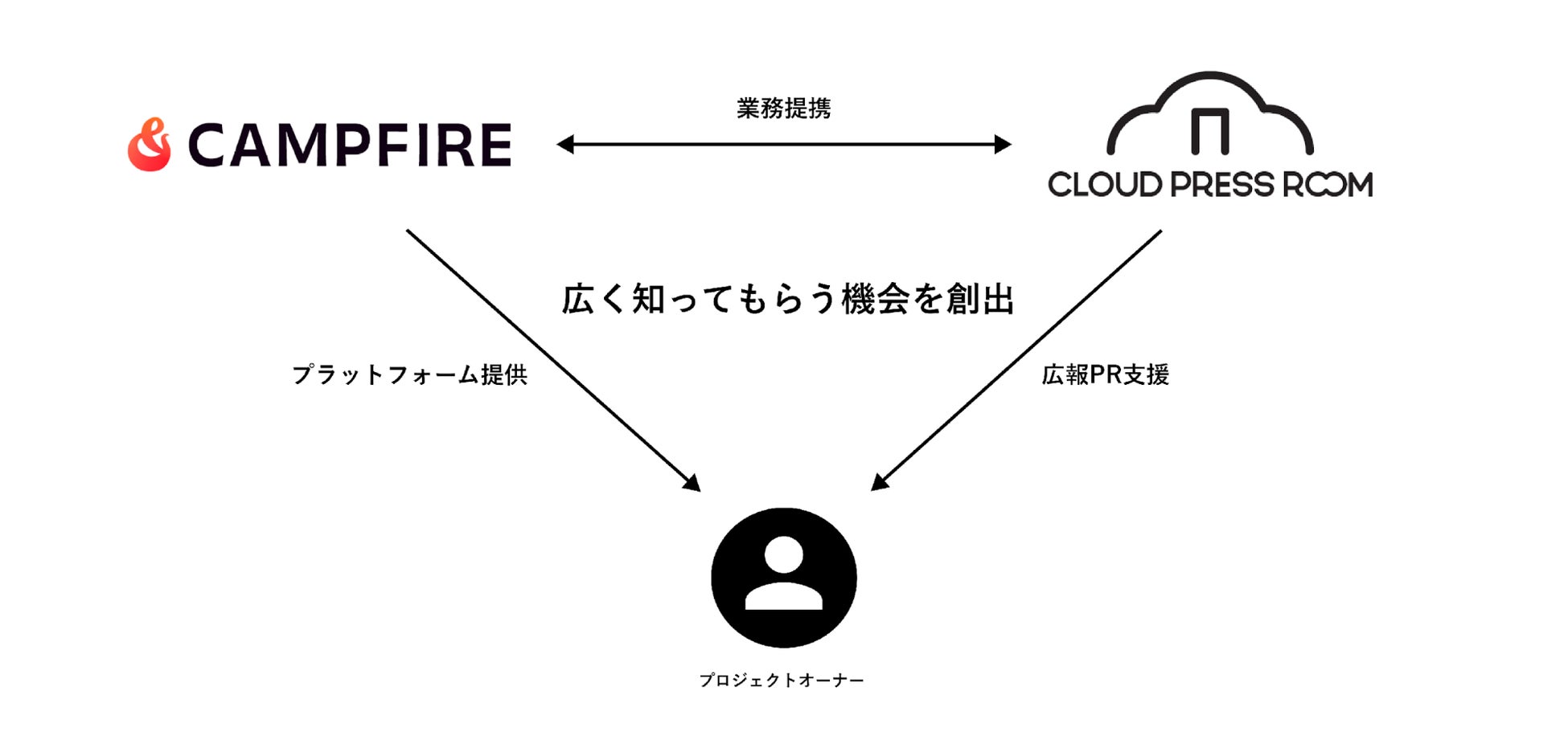 この度、CAMPFIRE社と「CAMPFIRE」で展開されるプロジェクトをPR支援で連携できる事を大変嬉しく思っております。弊社はCLOUD PRESS ROOMという、広報PRにおけるメディアとのマッチングを実現するサービスを展開していますが、CAMPFIREを利用される企業・個人・団体のサービスや商品を、PR会社ならではの視点でサポートさせて頂き、メディアリレーションの強化とPR戦略のサポートを行い、世の中にまだ知られていない価値あるプロジェクトを広めるべく、チーム一丸となって取り組んでまいります。