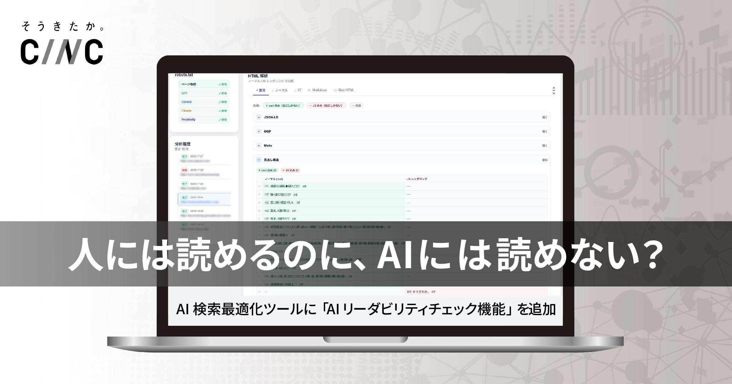 そこでCINCは、AIから見たときのサイト構造やテキストを可視化し、AIにとって読み取りやすいサイトかどうかを確認できる「AIリーダビリティチェック機能」を開発しました。