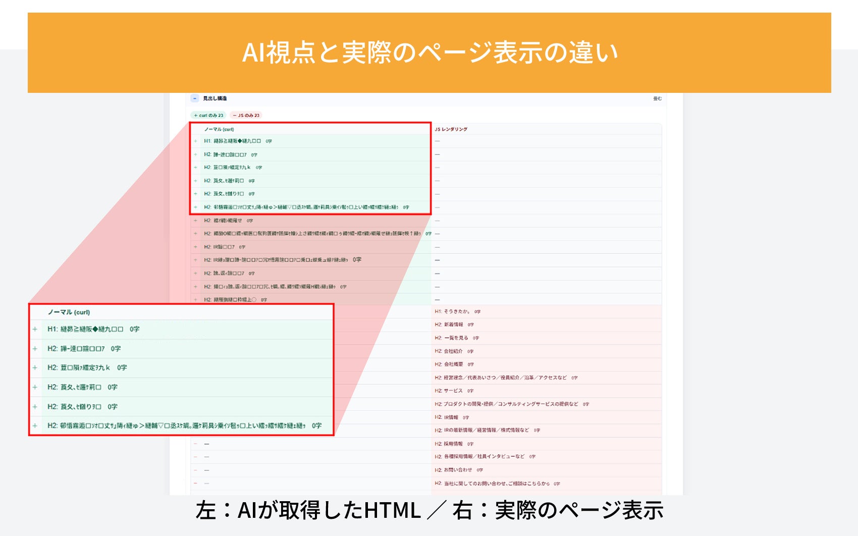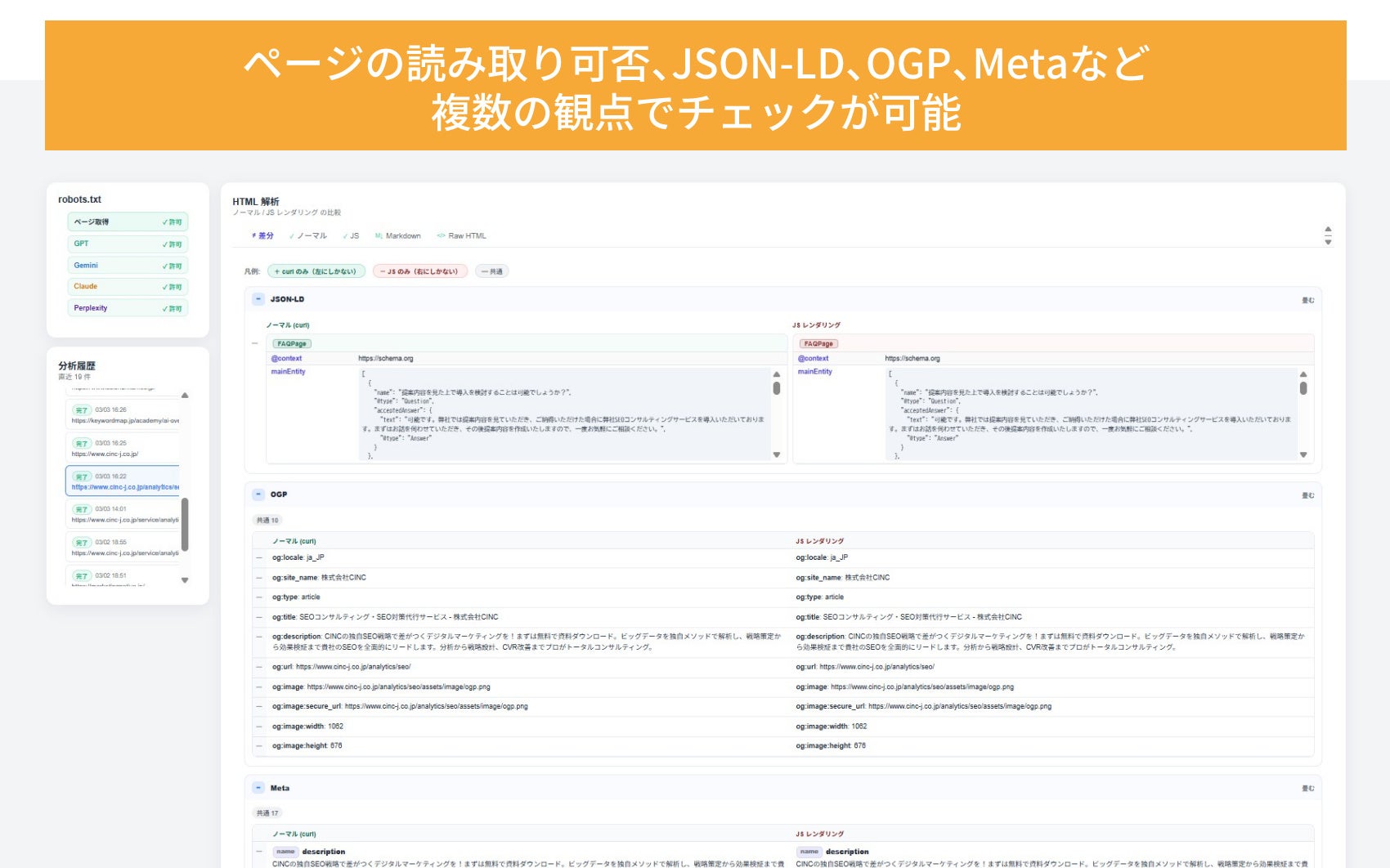 本機能では、対象のWebページのURLを入力し、AIから見たページの内容(HTML情報)と、人間の目で見たときの表示の差異を確認することが可能です。
