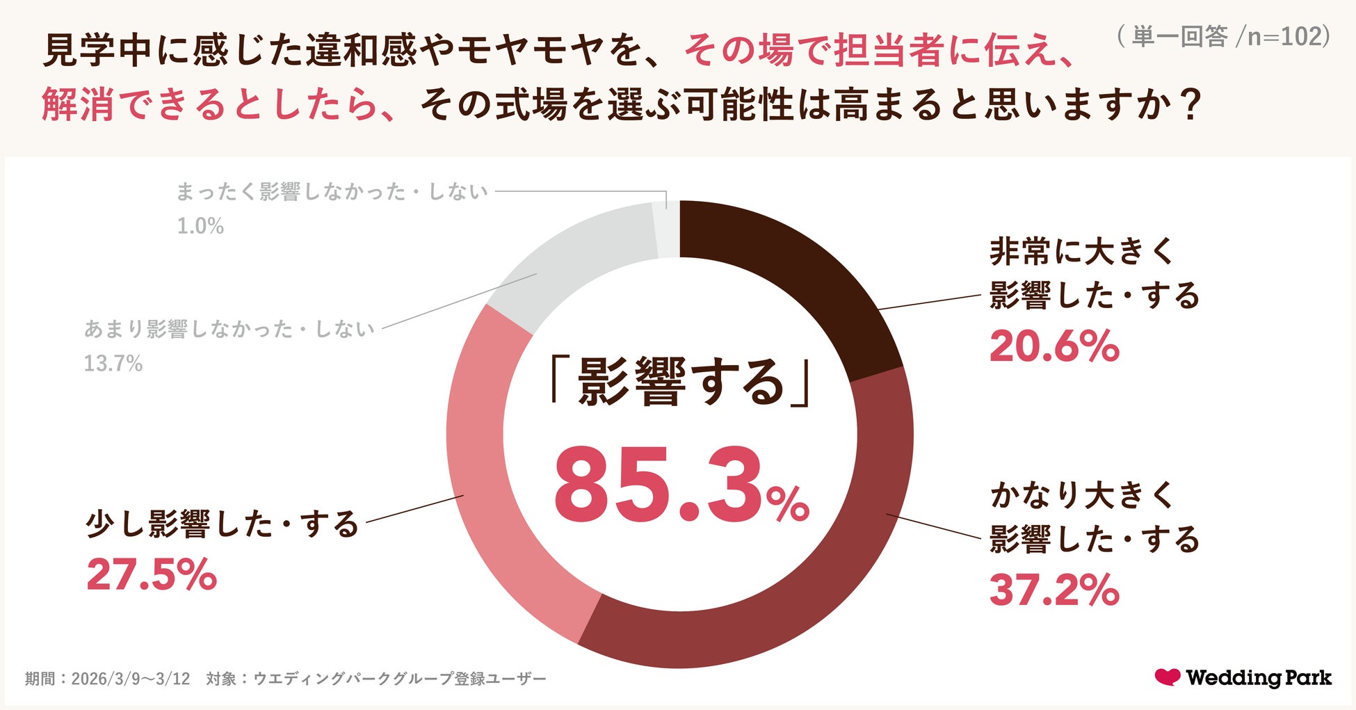 ※:ウエディングパーク実施 結婚式場見学・フェア来館時の「本音」に関する調査(期間:2026/3/9〜3/12)(n=102)
