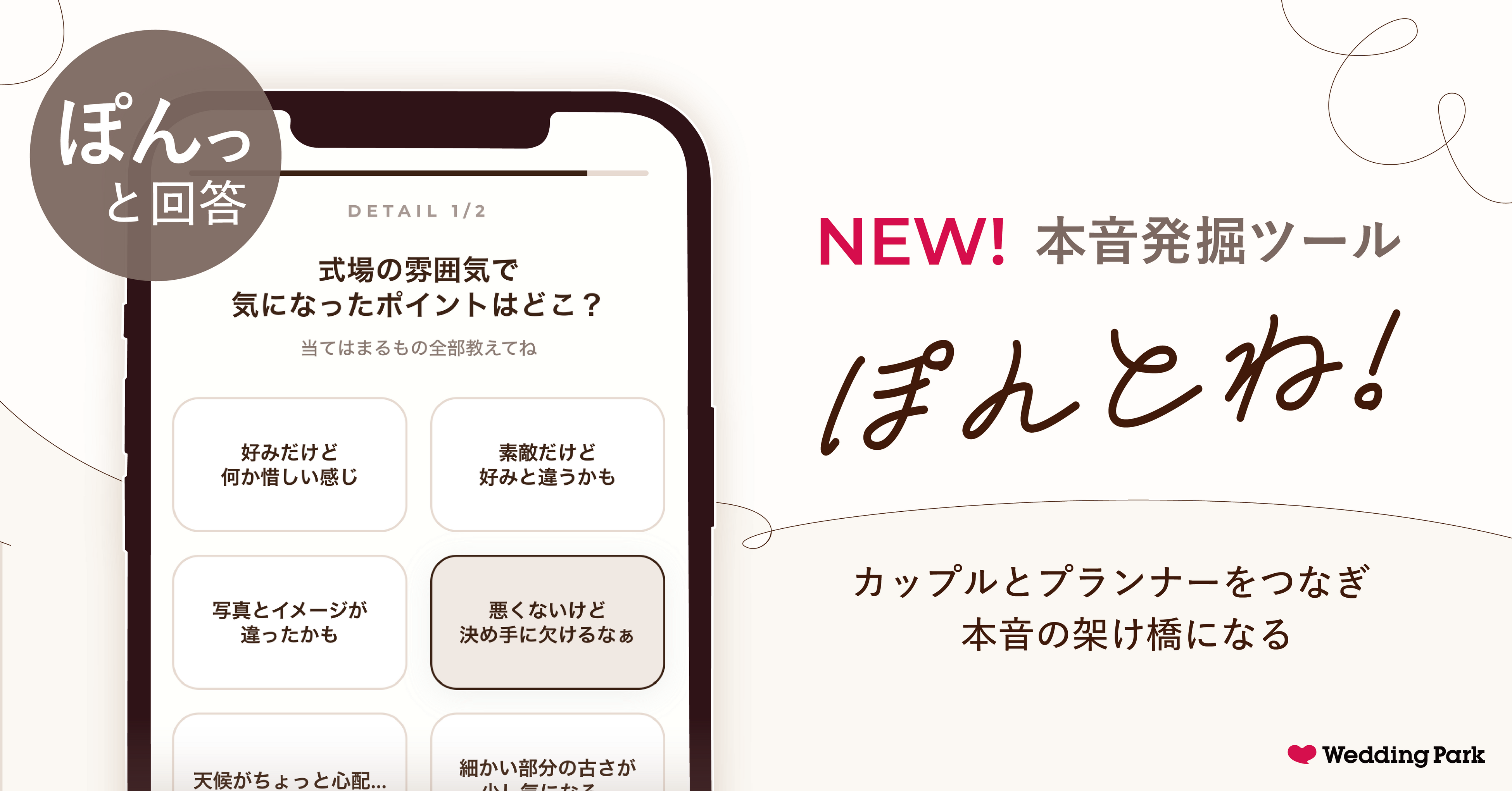 株式会社ウエディングパーク(本社:東京都港区、代表取締役社長:日紫喜誠吾)は、結婚式場向け顧客サーベイツール「survox(サーヴォックス)」のリデザインとして、カップルの本音をいち早く引き出す本音発掘ツール「ぽんとね!」を2026年3月25日(水)にリリースいたします。