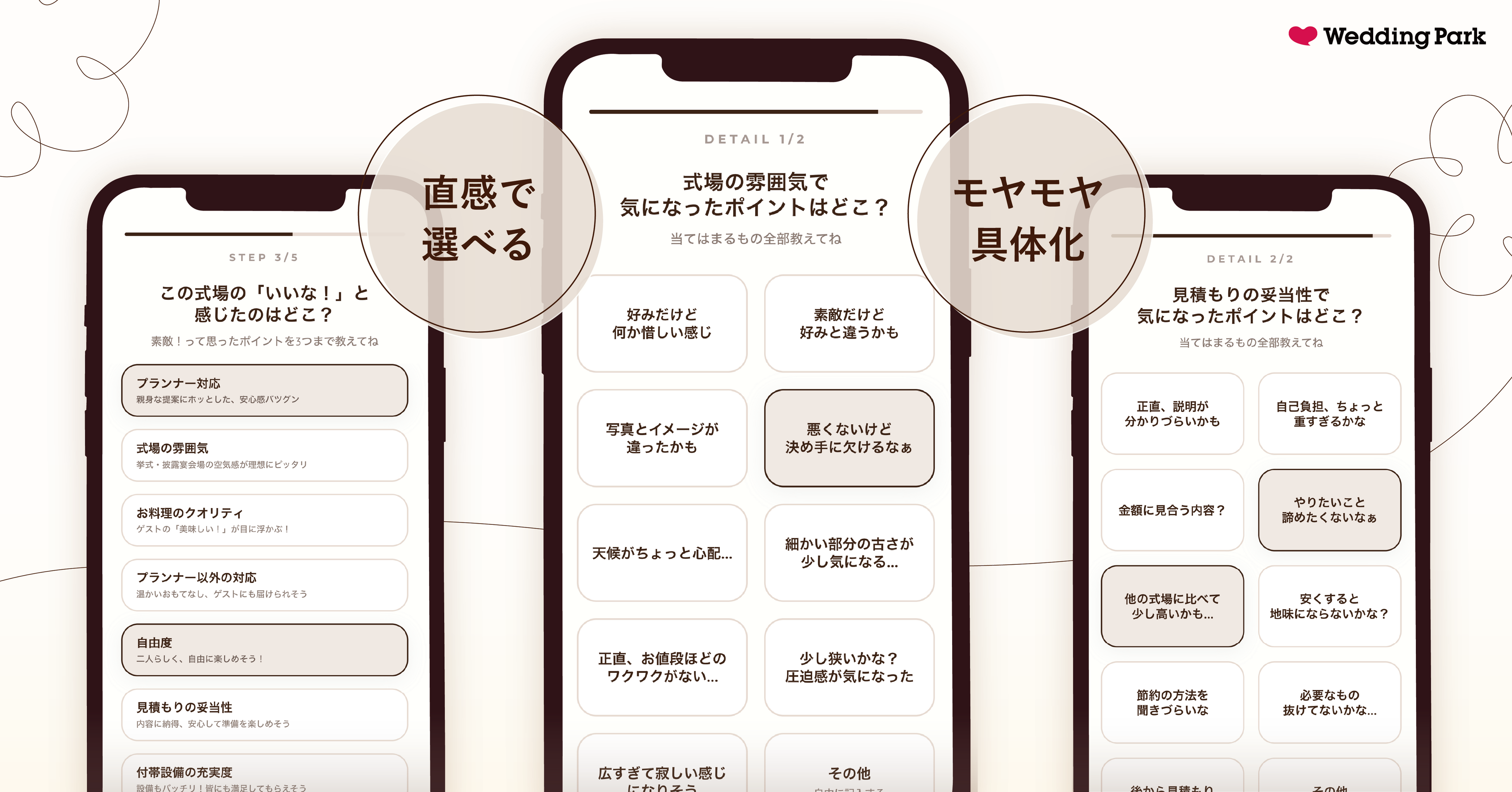 カップルが言葉にしづらい具体的な「声」を、「選ぶだけ」で表現できる選択肢設計です。実際の接客シーンで生まれる「モヤモヤ」を具体的な言葉として提示することで、本音を直感的に引き出します。