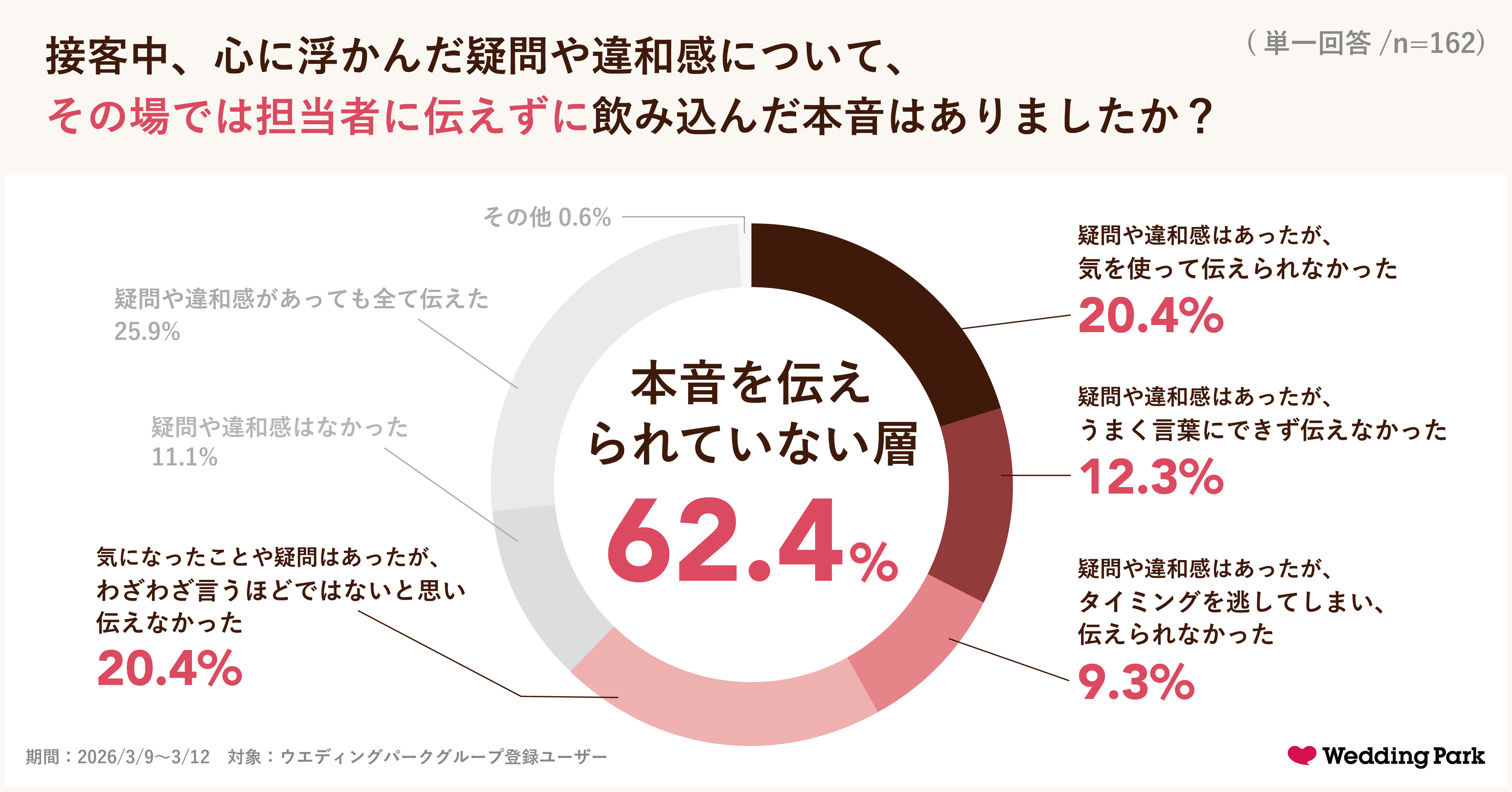 ※4:ウエディングパーク実施 結婚式場見学・フェア来館時の「本音」に関する調査(期間:2026/3/9〜3/12)(n=162)