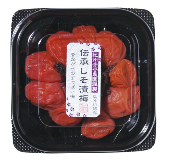 伝承白梅干を自家製の「薫りしそ」で重ね漬けしたしそ漬け梅です。塩辛くなく、梅本来のすっぱい旨みをお楽しみください。※塩分約15%