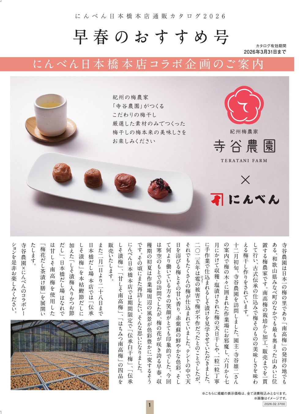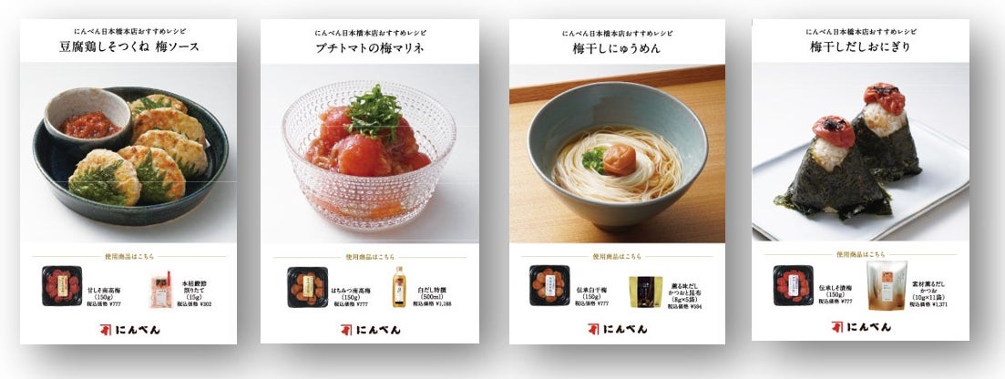株式会社にんべん(東京都中央区、代表取締役社長 髙津伊兵衛)は、寺谷農園株式会社(和歌山県日高郡、代表取締役社長 寺谷 雄二)との期間限定コラボレーション企画を2026年2月1日(日)から実施いたします。コラボレーション内容として、「にんべん 日本橋本店」にて寺谷農園の梅干し4種類を販売するほか、梅干しとにんべんのだしや調味料を使った料理をご紹介するレシピカードを配布します。また、「日本橋だし場 本店」では、梅の風味とだしの旨みがやさしく広がる「しそ漬梅入りかつお節だし」を、「日本橋だし場 はなれ」では、春のおとずれを感じられる、彩り豊かな「梅花だし茶漬け御膳」を期間限定で提供いたします。かつお節・かつお節だしとの組み合わせを通じて、「梅干し」の可能性・魅力をぜひ感じてみてください。