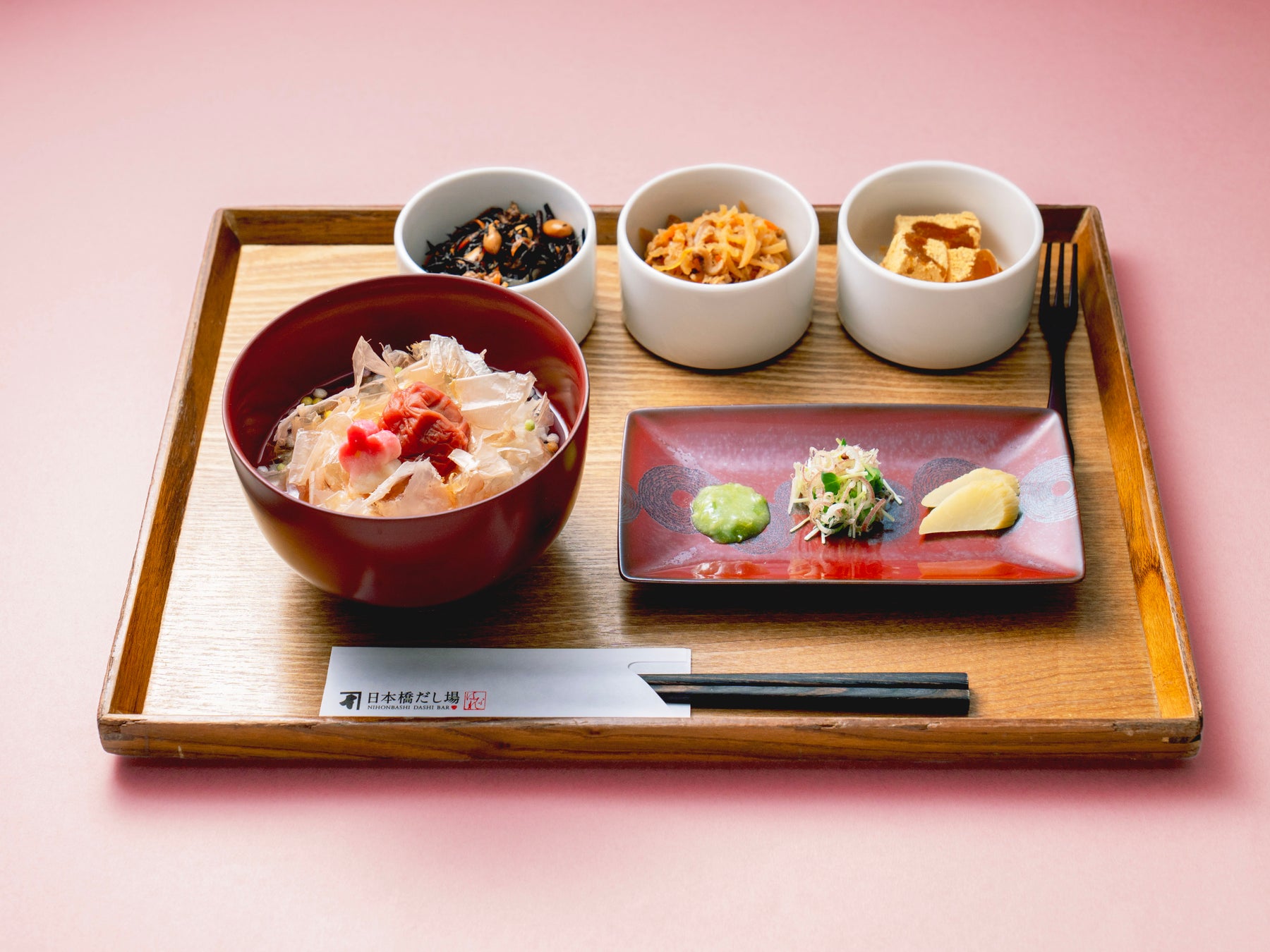 梅干しのさわやかな酸味と本枯鰹節の芳醇な香りが味わえるお茶漬けと、惣菜、甘味がセットになった御膳です。お茶漬けは薬味と共にお楽しみください。